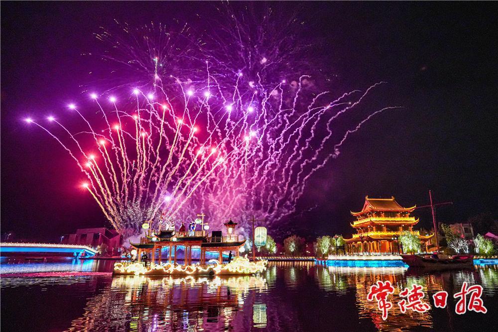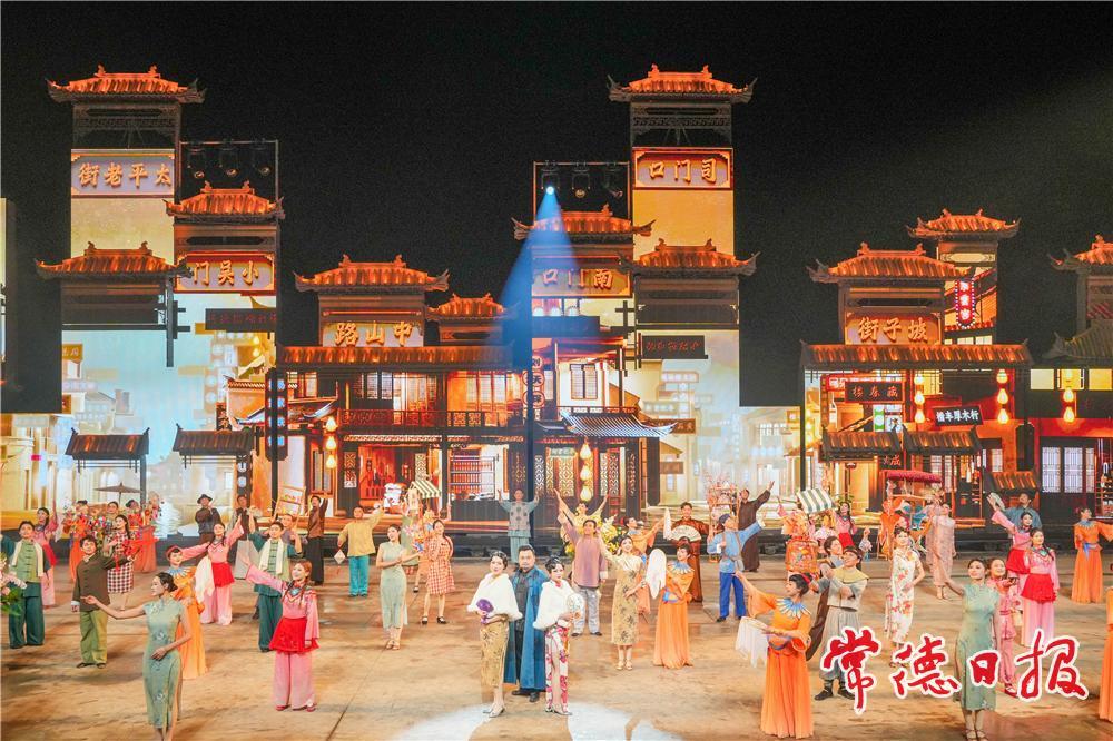 晚七点半钟,江岸鼓声震天,《花开靖港》大型情景剧在临水戏台浓情上演——大戏以1938年文夕大火为幕布,将虢堂主散尽家财护文脉、巧姑娘冒死藏典籍、戏班子舍生救难民的壮举凝练成血色浪漫。最为震撼处,莫过于“八元堂”夜宴上,虢堂主捧出甜酒敬天地,转瞬火光吞没舞台,威亚特技再现商船倾覆的惨烈——演员从10多米高空坠入“火海”,却在多媒体投影中化作漫天飘飞的书页。一碗甜酒,从市井温情升华为民族气节的图腾。终幕时,千架无人机托起燃烧的“文夕电报”升空,与芦江烟花共舞,灿若星河,将家国情怀与江湖侠义燃至沸点!