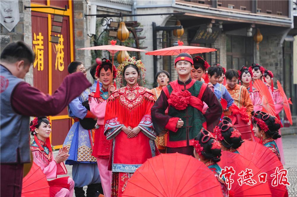 更热闹的当属街头婚庆表演:新郎红衣小帽,新娘凤冠霞帔,伴娘团手持油纸花伞踏着唢呐节奏翩跹而过,引得游客追随相看,红绸翻飞间,游客恍若闯入一幅“市井长卷”。相较桃花源古镇,靖港的烟火气更显珍贵——老师傅掌心的茧、甜酒桶边的木纹,甚至伞面上晕染的桐油香,无不在诉说着“活着的历史”。