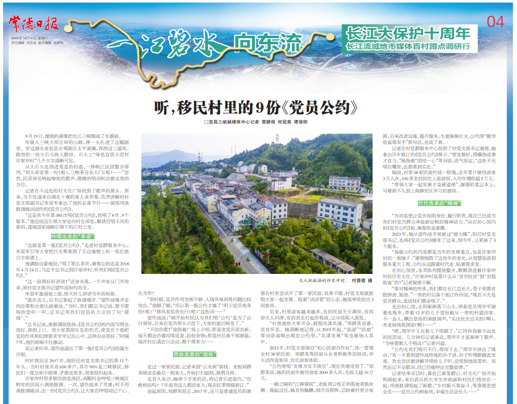 许家冲村很多移民曾是渔民,闲暇时会哼唱三峡地区特有的民间小调渔鼓调。一次,望作战来了灵感:何不用渔鼓调填词,出一份《党员公约》,让大家在哼唱间记于心、化为形?