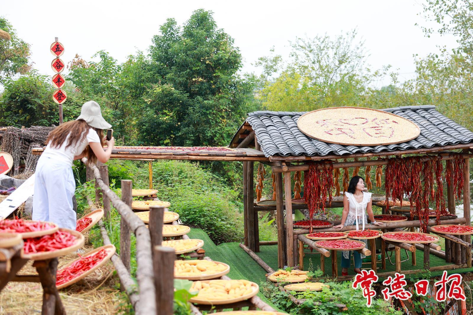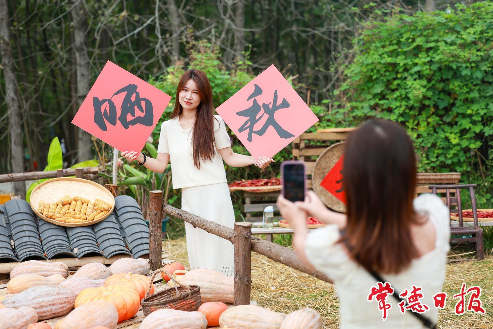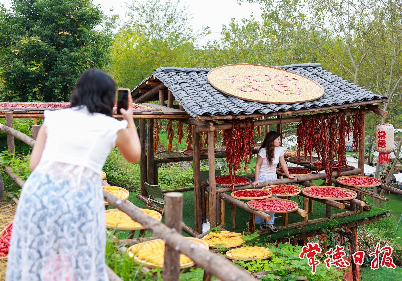 10月5日,常德市武陵区的丹野花田农场里五谷丰登、瓜果飘香,众多游客前来打卡拍照,秋日氛围浓厚,描绘出一幅生动的晒秋图景。