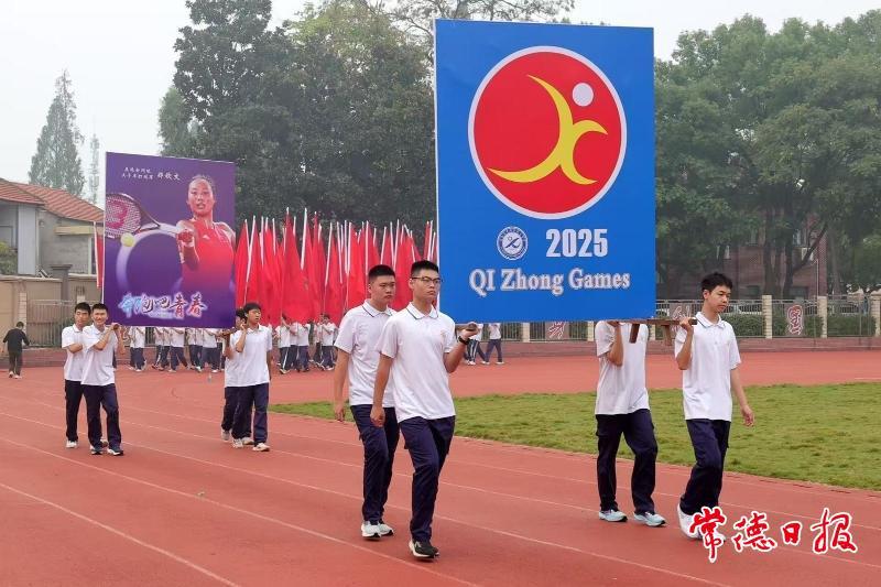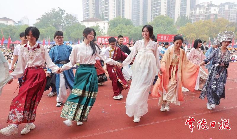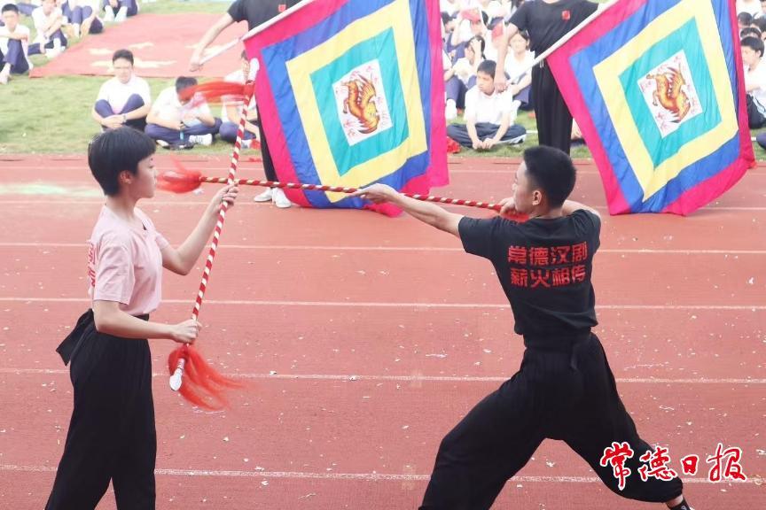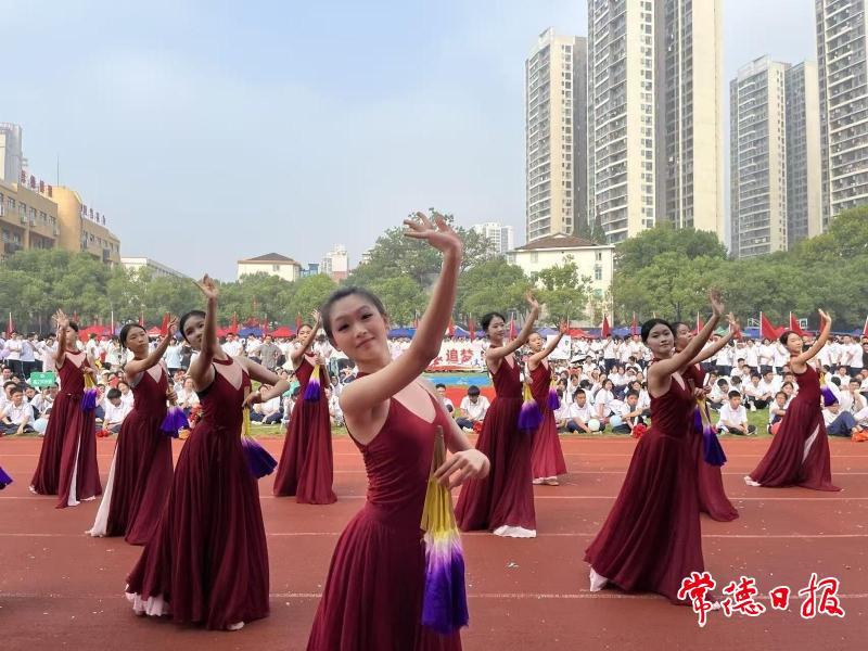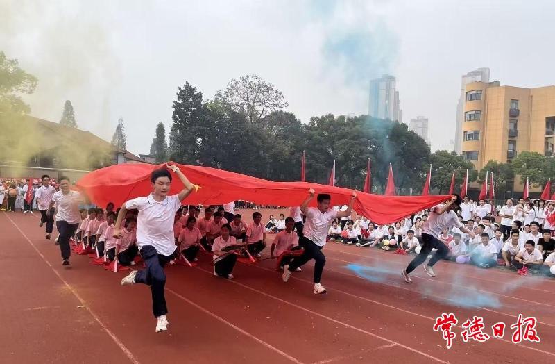 初中部学生的表演同样活力满满。初2301班学生们有的骑自行车,有的踩轮滑,有的挥舞羽毛球拍,手持排球登场,多项运动元素的融合,展现出少年的灵动与活力;作为常德汉剧后备人才定向委培班的初2306班全体学生表演的《汉韵》将三年基本功训练的成果展示得淋漓尽致,凭借招式利落的精彩棍术,栩栩如生的模拟打斗场景赢得了观众满堂喝彩。“这是我最后一次参加校运会了,耍枪、翻跟头是基本功,能把所学展现给大家,再苦再累都值了。”该班学生上官仁杰说道。最后,校舞蹈队成员登场,其优美的旋律、轻盈的舞姿为开幕式画上圆满句号。