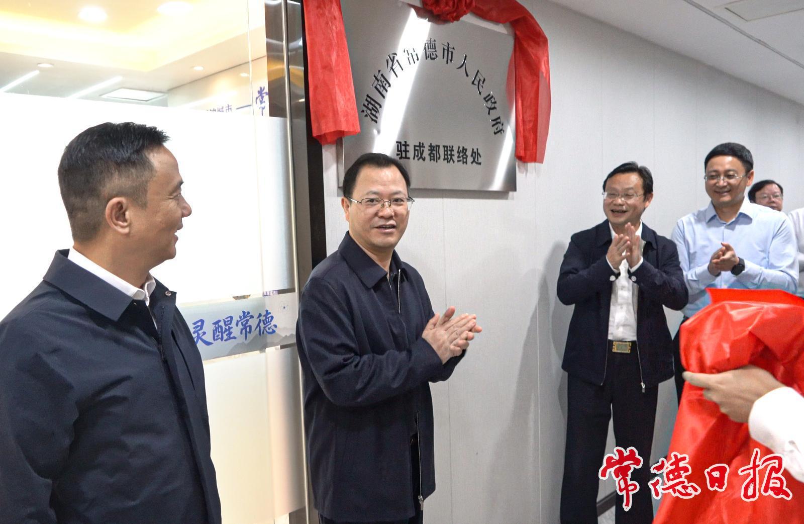 常德日报记者 陈欢 文/图 10月13日,常德市人民政府驻成都联络处揭牌仪式在成都举行。市委副书记、市长周振宇,市委常委、市委组织部部长向秀亮出席仪式并为联络处揭牌。