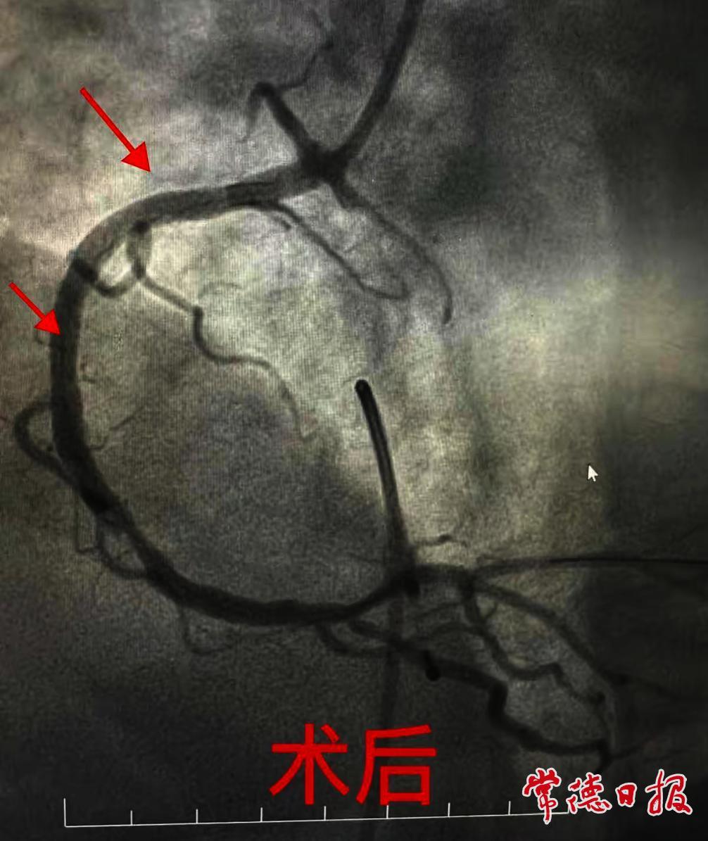 120急救人员到达现场后,将苏醒的陈老快速转运至常德市第一中医医院。经检查确诊为急性心肌梗死,心血管科二病区介入团队立即为其实施急诊介入手术,置入支架2枚,术后患者病情逐步稳定。
