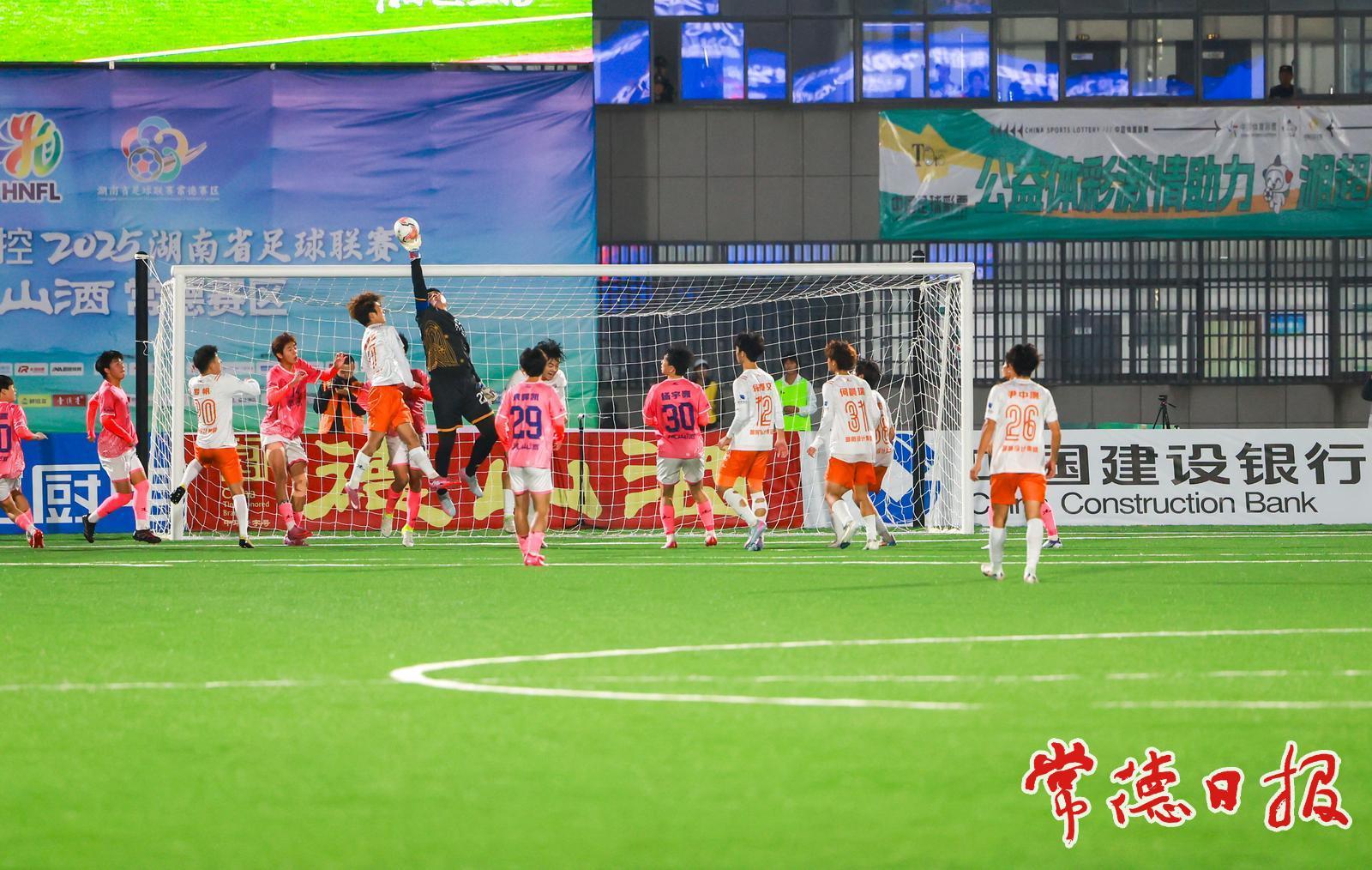 常德“门将”王峰琦飞身而起,奋力拦球。