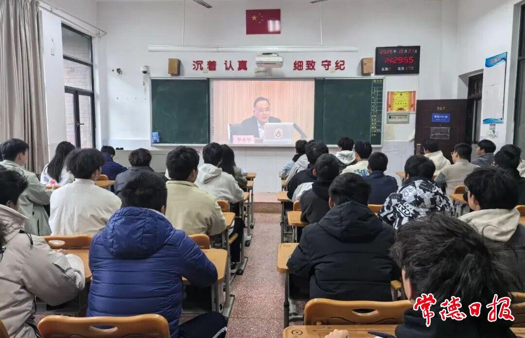 李永坚以“抗战胜利80周年”为切入点,通过照片、视频带新生回望历史,阐释“为何担当”。随后,他结合新时代十年成就、湖南锚定“三高四新”美好蓝图和常德“桃花源里的城市”定位,为新生擘画“为谁担当”的方向,点明各专业与国家发展的契合点,让学子明晰职业机遇。课堂尾声,他带领全体新生庄严宣誓“请党放心,强国有我”,将氛围推向高潮。