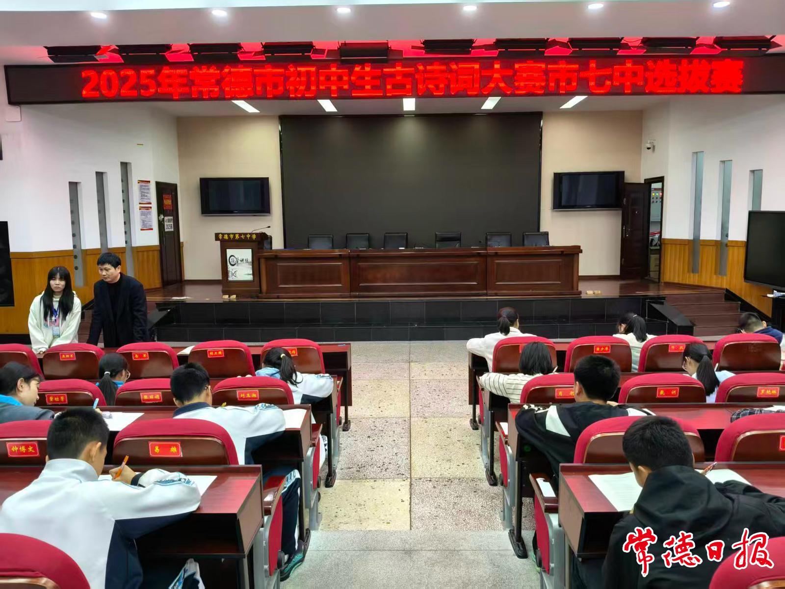 常德日报记者 黄云霞 通讯员 罗立波 文/图 近日,70余名诗词爱好者齐聚常德市七中常德市第二届初中学生古诗词大赛初赛选拔现场,尽显他们扎实的诗词积累和深厚的文化素养。