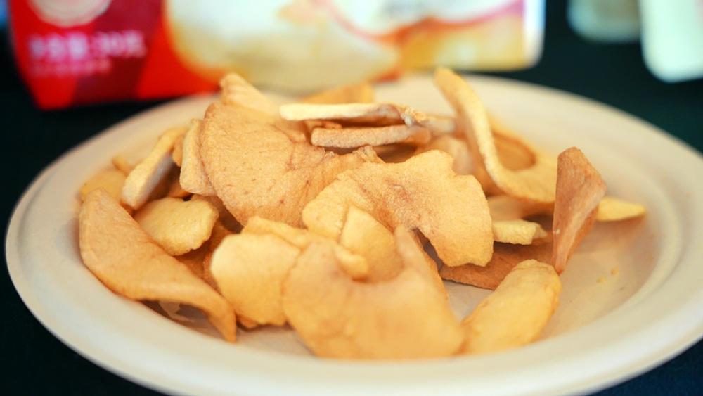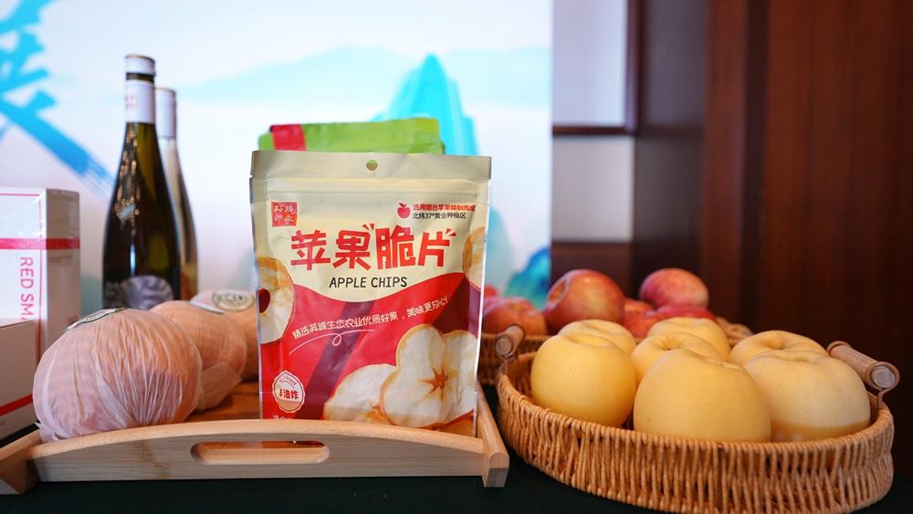 在展区现场,以苹果和梨为原料的深加工产品同样引人注目。苹果脆片、苹果干、梨干、梨汁、鲜梨炖等农产品深加工制品,展现了烟台农业产业链的延伸与创新。