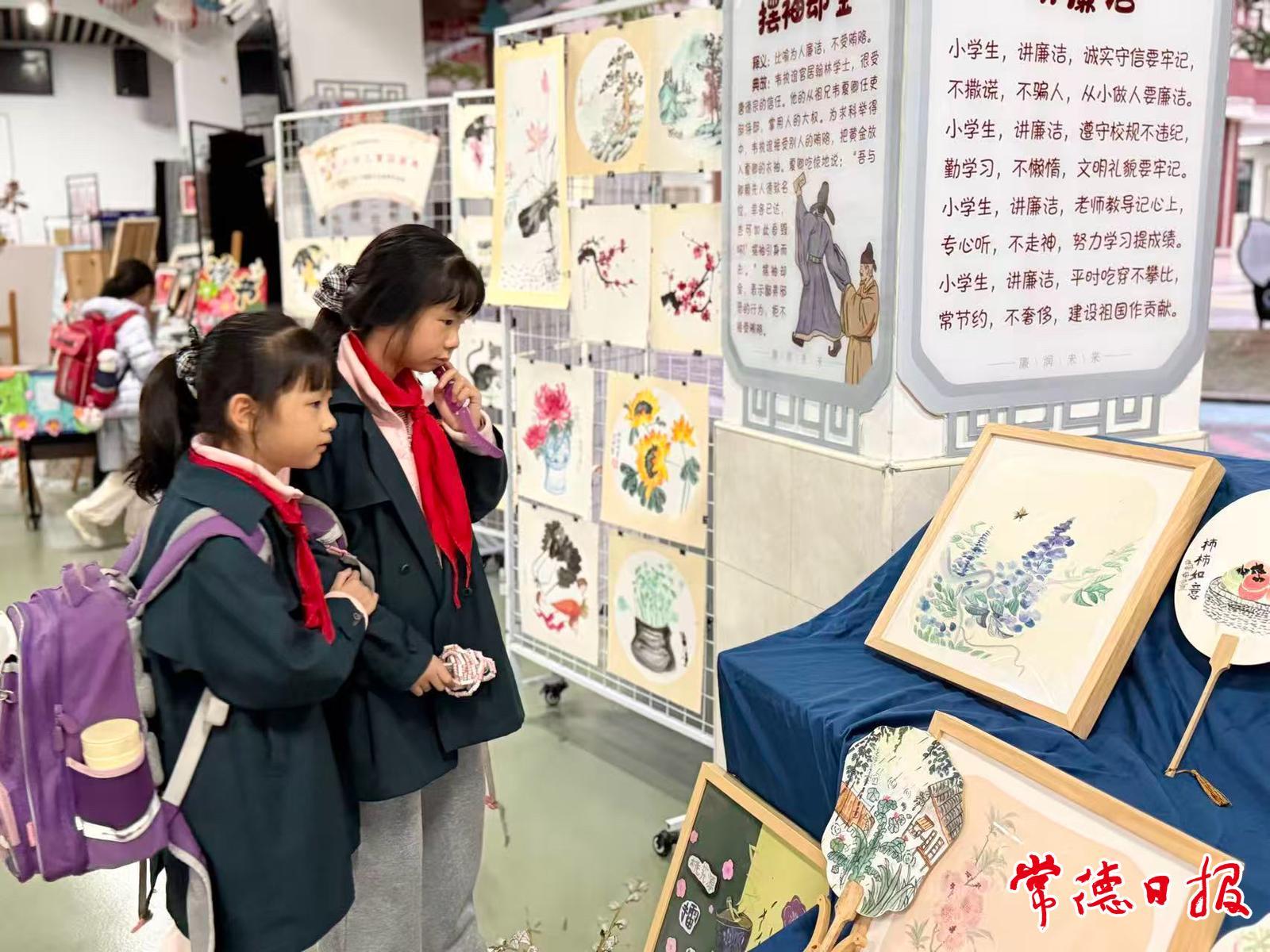期间,武陵区第一小学、武陵区育英小学、鼎城区严家岗小学、临澧县丁玲莲花小学等学校搭建的艺术展台引来学生观摩欣赏。