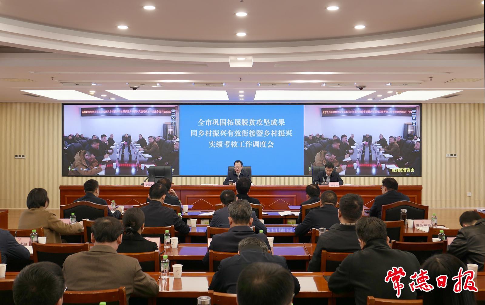 常德日报记者 陈欢 文/图 11月18日,常德市巩固拓展脱贫攻坚成果同乡村振兴有效衔接暨乡村振兴实绩考核工作调度会召开,深入学习贯彻党的二十届四中全会精神及习近平总书记关于“三农”工作的重要论述,全面落实中央、省委和市委相关重要文件精神,进一步压紧压实责任,加强查漏补缺,抓好问题整改,高质量完成过渡期收官任务。市委副书记、市长周振宇出席并讲话。