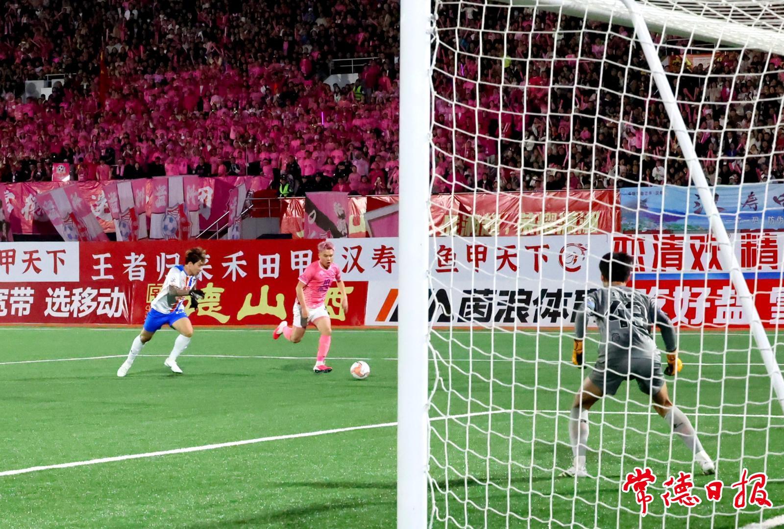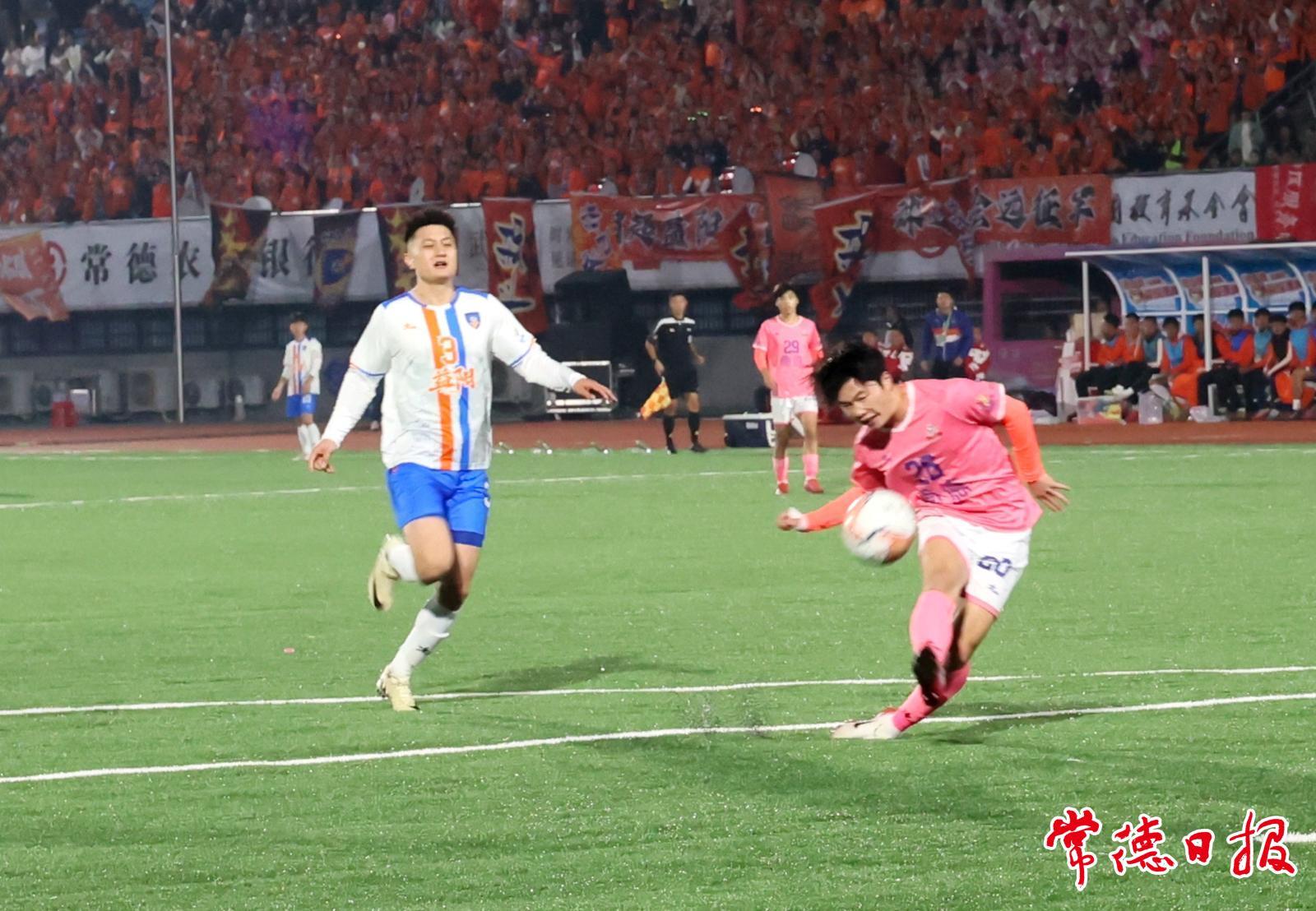 比赛开场,常德队发起猛烈攻势。第16分钟46秒,球队获得关键点球机会,10号球员赵文荻顶住压力率先破门,以1∶0为球队抢占先机。第29分钟,赵文荻接队友精妙直传冷静破门,完成梅开二度,将比分扩大至2∶0。仅1分钟后,他再次抢点扫射破门,上演帽子戏法,将比分改写为3∶0。球迷们的持续呐喊与加油声,成为球队奋勇拼搏的坚强后盾。