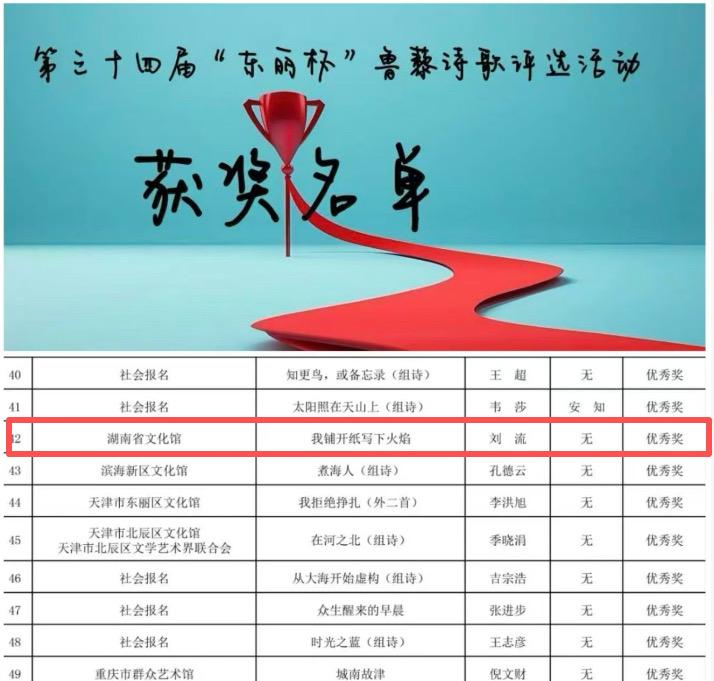 在全国性文学赛事中,常德作协作家表现亮眼。第八届“贵州大曲杯·记忆里的味道”全国征文大赛上,作协副主席许玲承载着浓厚乡土人情与童年温情时光的作品《风扇转黄瓜甜甜酒飘香》获三等奖;主席团委员戴志刚语言质朴、充满生活气息的作品《母亲的坛坛罐罐》,斩获三等奖,他们用文字勾勒出岁月里的烟火气息与人文情怀,引发读者广泛共鸣。第三十四届“东丽杯”鲁藜诗歌评选活动中,作家刘流创作的诗歌《我铺开纸写下火焰》凭借深刻的情感表达与独特的艺术笔触,荣获优秀奖。