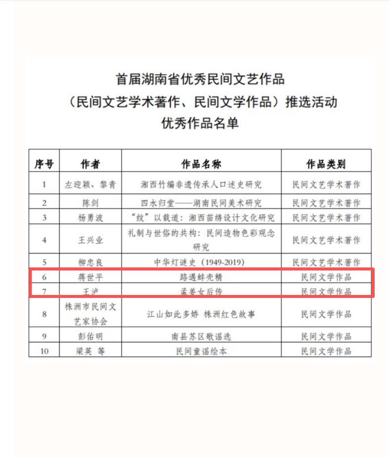 省级评选中,常德作协同样收获颇丰。首届湖南省优秀民间文艺作品推选活动评审公示结果显示,作家蒋世平的《路遇蚌壳精》与王沪的《孟姜女后传》两部民间文学作品凭借深厚的文化底蕴和生动的故事演绎,成功入选优秀作品奖,为常德民间文学的传承与创新增添了一抹亮色。