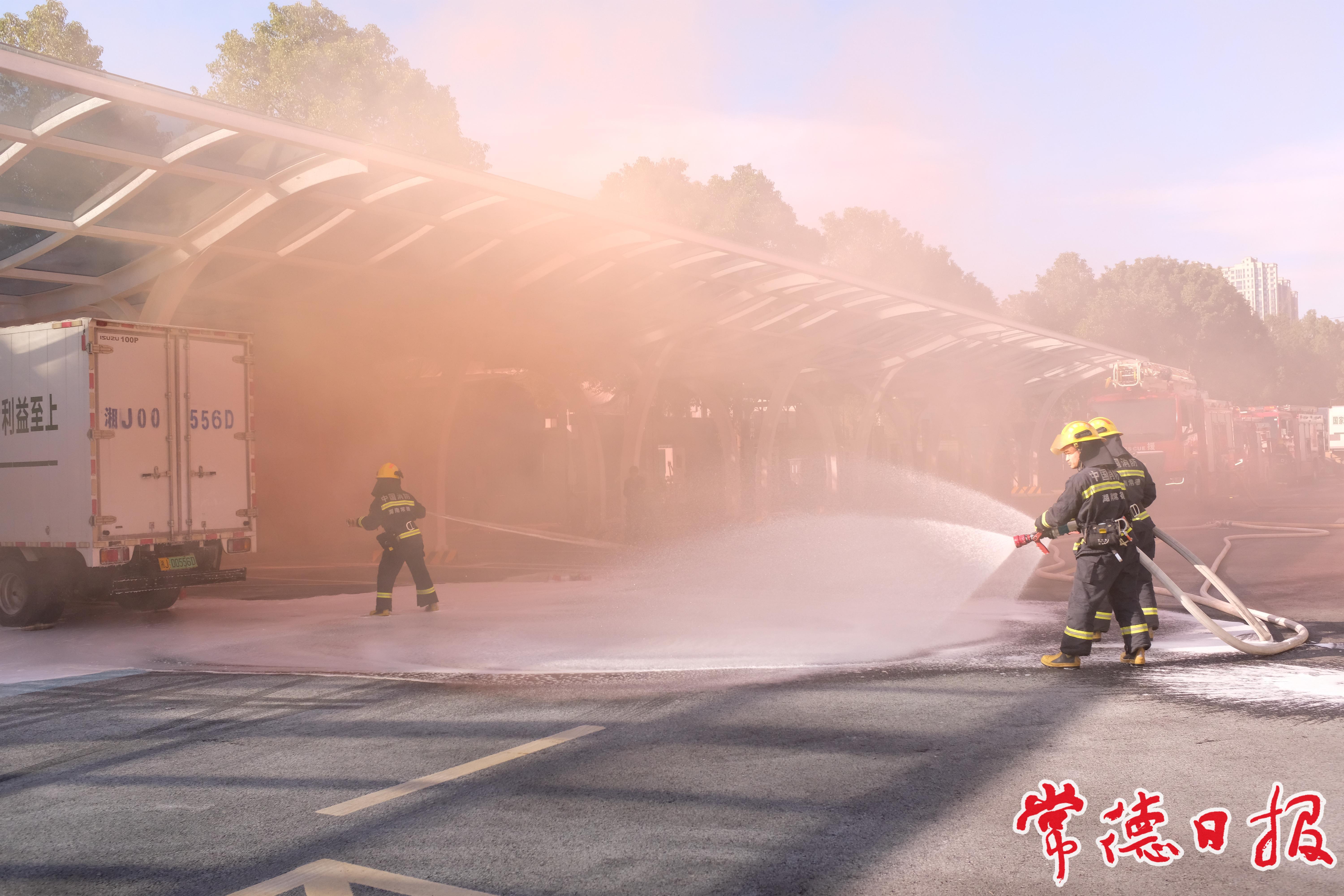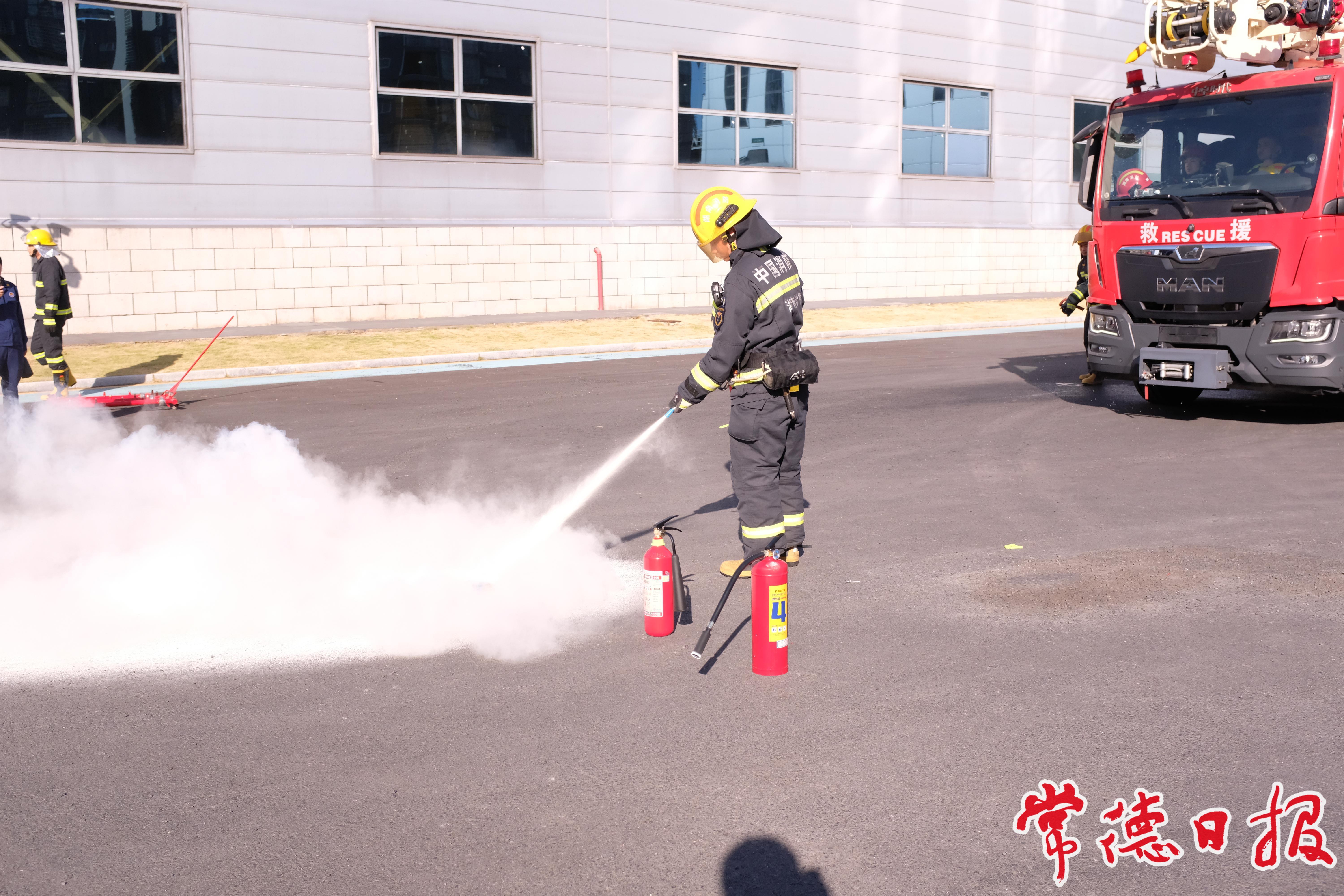 演练前,常德市消防救援支队的消防员还以现场实验的方式,向所有观摩人员讲授了“锂电池火灾特性和灭火方法”,重点展示水、泡沫、二氧化碳、七氟丙烷、干粉等5种灭火剂对锂电池火灾的灭火效能,宣传普及新能源车火灾特点及灭火方法。