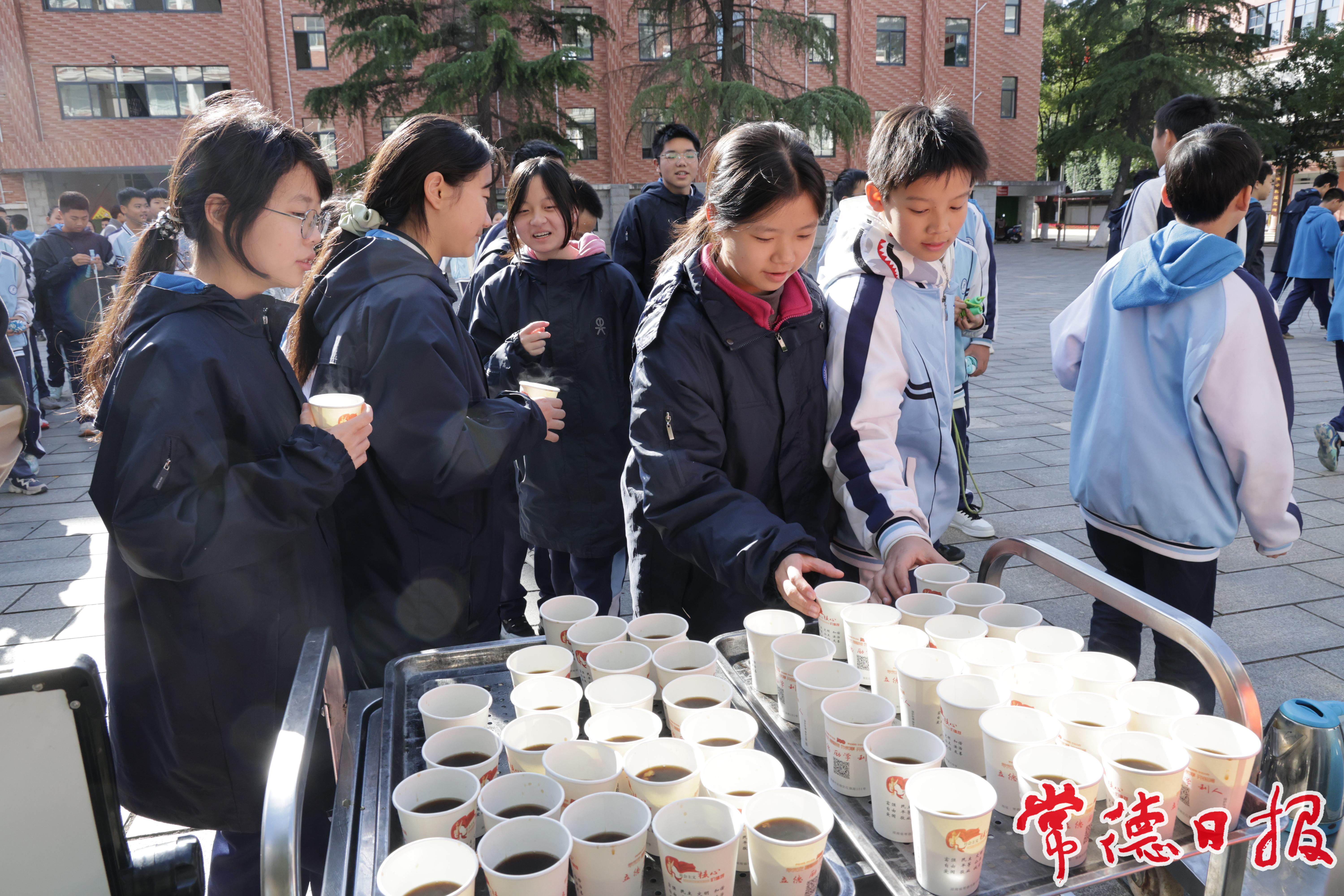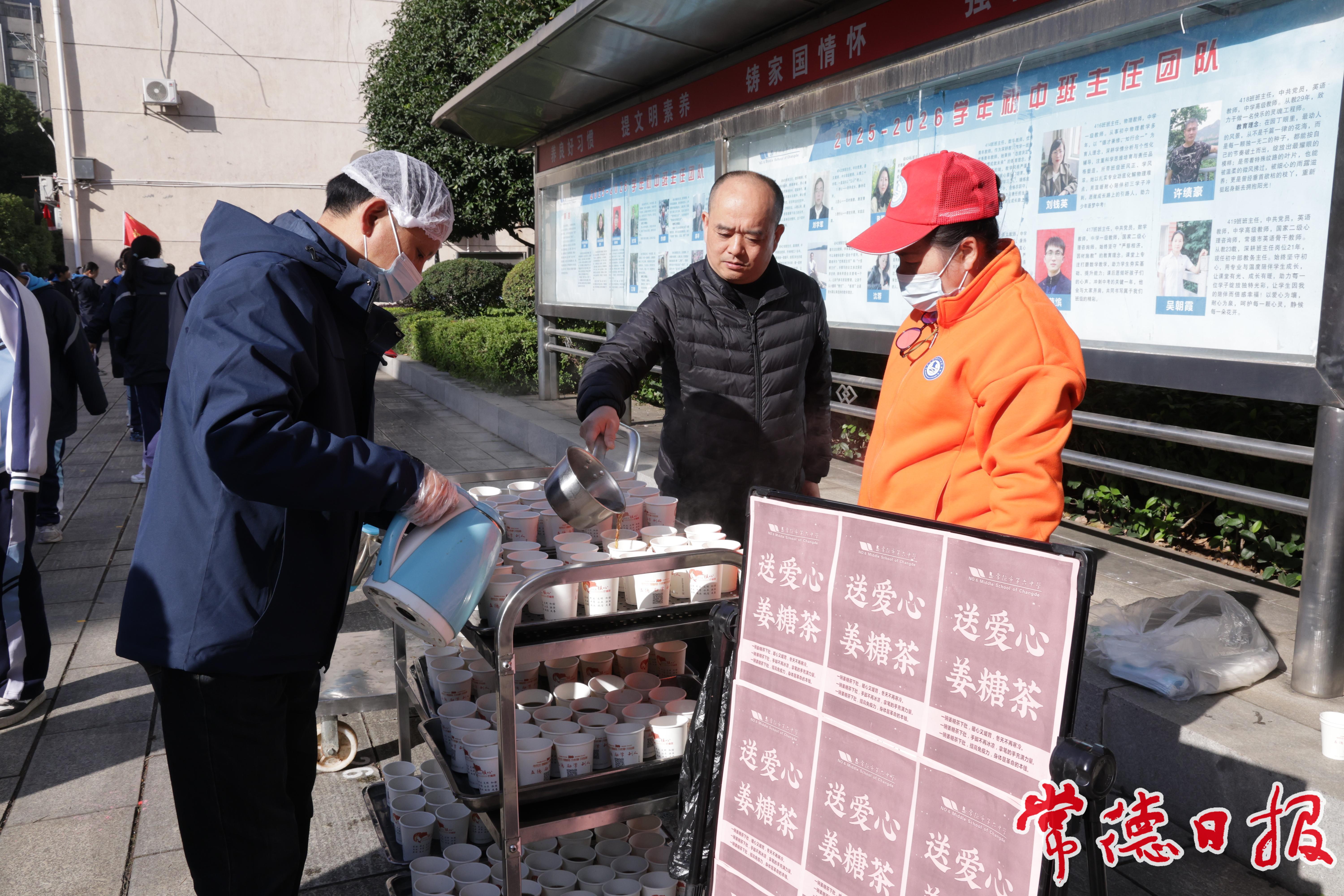 常德日报记者 李龙 通讯员 翦辑 刘辉 文/图“来,喝杯热姜茶,暖暖身子!”11月25日大课间,常德市第六中学操场上,学校总务科工作人员有条不紊地为师生们递上一杯杯热气腾腾的姜糖茶。