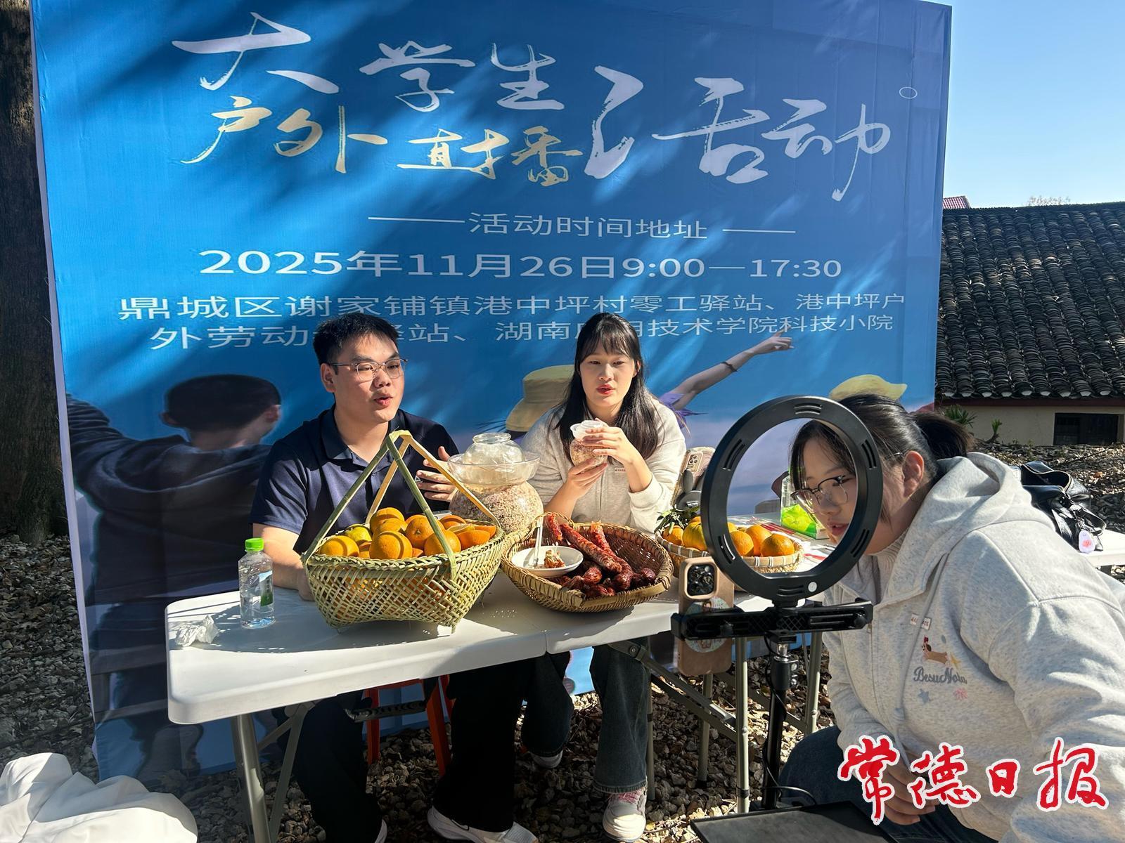 常德日报记者 刘清 伍银 通讯员 欧阳章俊 文/图 “家人们,这是我们刚刚采摘的橙子,香甜多汁,现在下单直接从田间发货!”11月26日,鼎城区谢家铺镇港中坪村的田间地头热闹非凡,来自湖南应用技术学院的大学生们化身“助农主播”,对着手机镜头熟练地介绍着本地特色农产品。当天,以“驿站搭台・筑梦乡村”为主题的2025高校毕业生就业创业服务系列活动,让70余名高校学子在田间课堂中完成了从理论学习到实操带货的全方位实训。