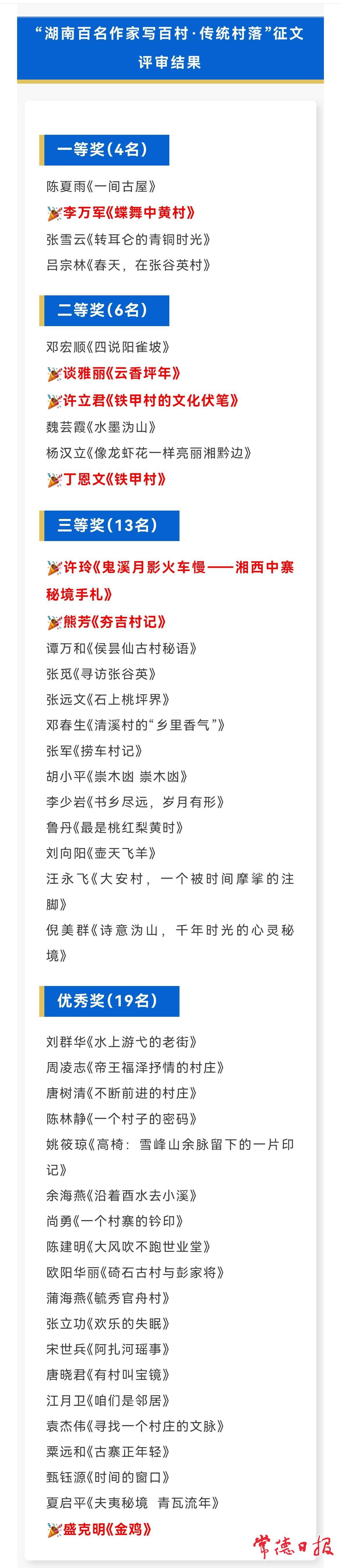 常德日报记者 黄云霞 通讯员 唐益红 文/图 近日,“湖南百名作家写百村·传统村落”征文评审结果正式揭晓,常德市作协7名作家获奖,分别是一等奖1个、二等奖3个、三等奖2个、优秀奖1个,实现了奖项全覆盖。