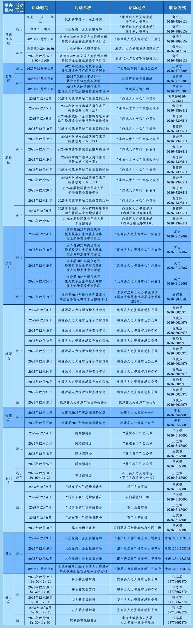 本月系列招聘活动采取“线上+线下”模式进行。求职者除参加线下面对面交流外,还可通过“湘西北人力资源市场”抖音号或视频号、“武陵政府网”微信公众号、“鼎城人才中心”抖音号等线上平台实时获取岗位信息、参与直播互动,实现“云端求职、指尖选岗”。