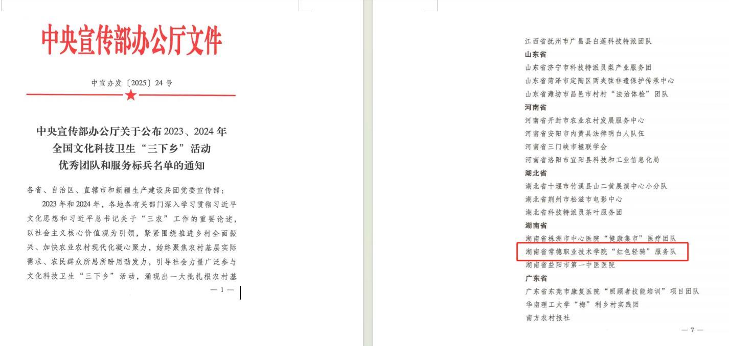 常德日报记者 李龙 通讯员 刘烨 何琼 文/图 近日,中央宣传部办公厅印发《关于公布2023、2024年全国文化科技卫生“三下乡”活动优秀团队和服务标兵名单的通知》,常德职业技术学院“红色轻骑”服务队荣获2023年全国文化科技卫生“三下乡”活动优秀团队称号。