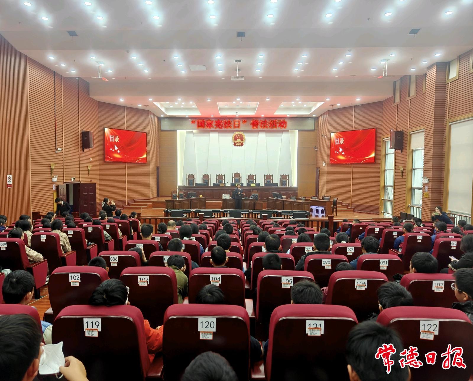 常德日报记者 江一舟 姚璇 文/图 12月4日是国家宪法日,常德市二中、常德市十七中及武陵区旭辉东升小学的170余名师生走进武陵区人民法院第一审判庭,旁听刑事案件庭审、参与普法互动,上了堂别开生面的“沉浸式”宪法宣传课。