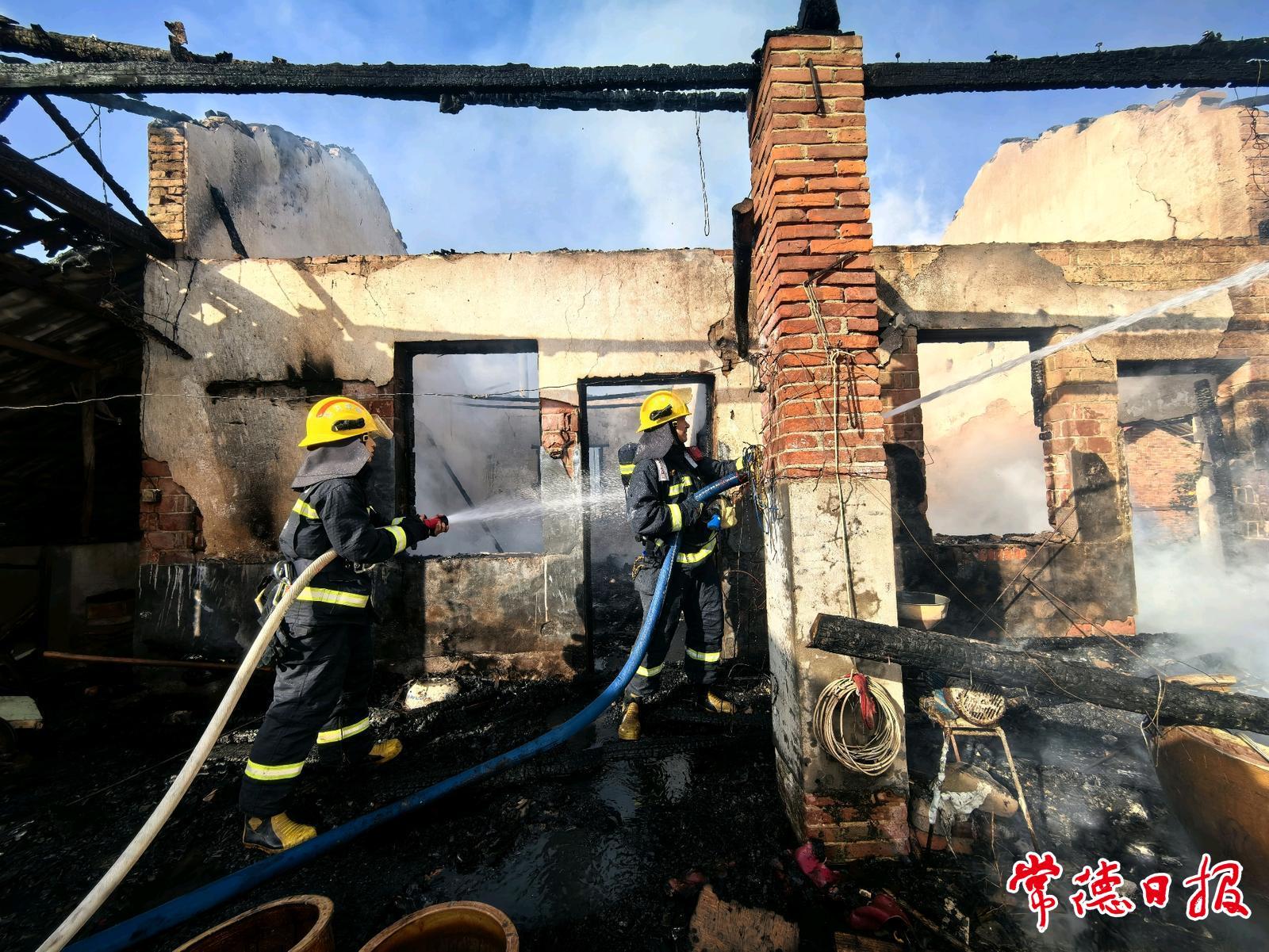 类似因线路问题引发的火灾并非个例。就在不久前,武陵区石门桥镇一处民房也遭遇火患。11月27日14时47分,当地消防员赶到现场时,偏房火势已十分猛烈,并有向相邻房屋蔓延的趋势。消防员立即出水扑救,并通过轮流作业,将屋内堆放的杂物翻开、转移,隔离燃烧物,最终成功控制火情。户主事后回忆,该房间内放有冰箱、电视等电器,因线路年久失修发生短路,溅落的火星引燃了旁边的纸箱。加之房间密闭、杂物堆积,热量无法散发,导致火势迅速扩大,酿成火灾,幸好未造成人员伤亡。