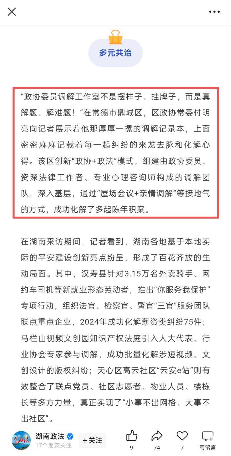 常德市委政法委充分发挥统筹协调作用,结合各地突出矛盾特征,牵头推动市直公安、检察、法院、司法、信访、自然资源、工会、妇联等行业部门和群团组织,100%进驻县市区综治中心,形成了矛盾纠纷多元化解新格局。鼎城区创新“政协+政法”模式,组建由政协委员、资深法律工作者、专业心理咨询师构成的调解团队,深入基层,通过“屋场会议+亲情调解”等方式,化解矛盾纠纷。汉寿县针对3.15万名外卖骑手、网约车司机等新就业形态劳动者,推出“你服务我保护”专项行动,组织法官、检察官、警官“三官”服务团队联点重点企业,2024年成功化解薪资类纠纷75件。