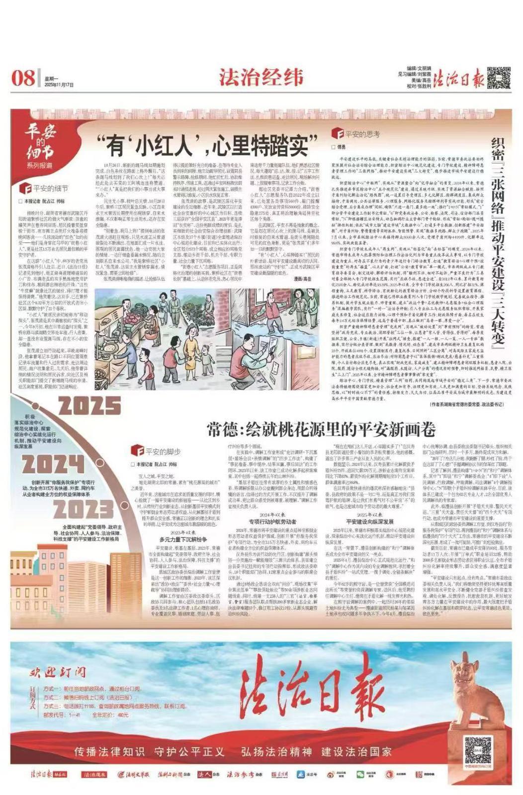 《法治日报》“法治经纬”专版集中刊发三篇报道。报道《常德:绘就桃花源里的平安新画卷》,系统梳理了常德近年来的平安建设路径,还引用数据展示了常德平安建设的整体成效。报道《“有‘小红人’心里特踏实”》则将镜头对准基层,生动讲述了武陵区紫桥社区“街巷小红人”志愿服务队的故事,诠释了平安建设的民生温度与共建共治共享的基层活力。署名文章《织密“三张网络”推动平安建设“三大转变”》系统阐述了常德通过织密“综治中心规范化建设”“专门学校建设”“严重精神障碍患者管理”三张核心网络,推动平安建设的深刻转变。“湖南政法”微信公众号推介了常德市综治中心实战运行的典型做法,深度解读了“桃花源里的城市”如何绘就一幅以高效能治理保障高水平安全的新画卷。