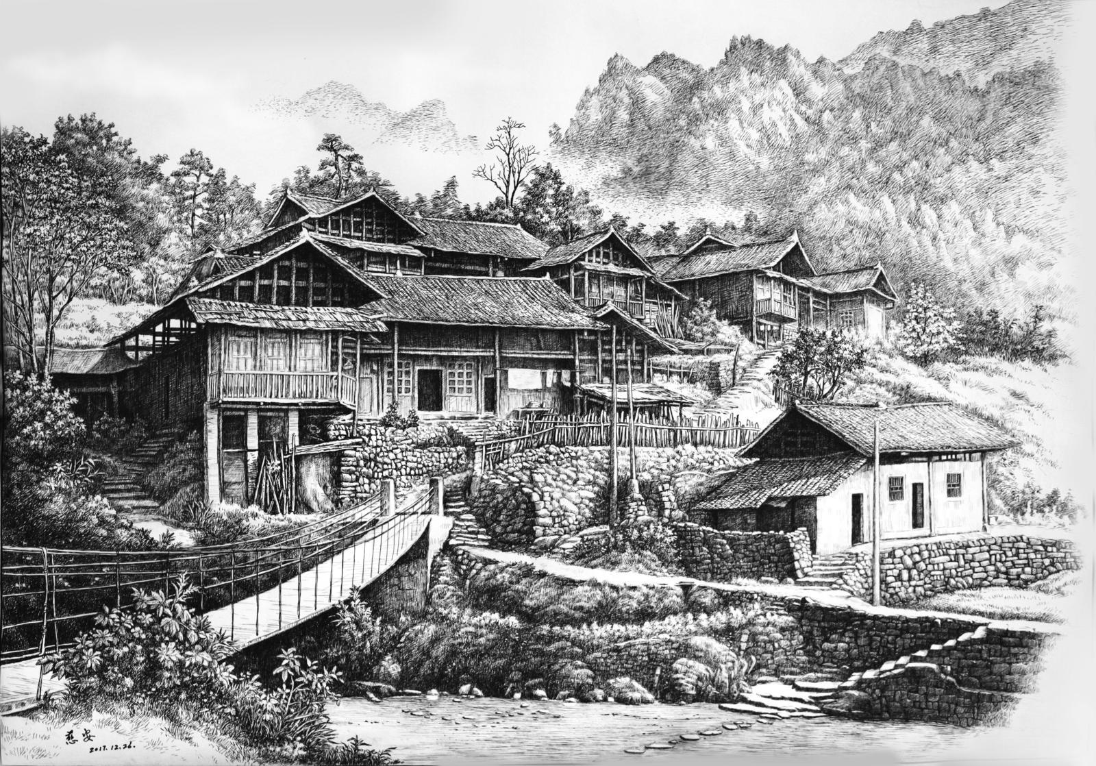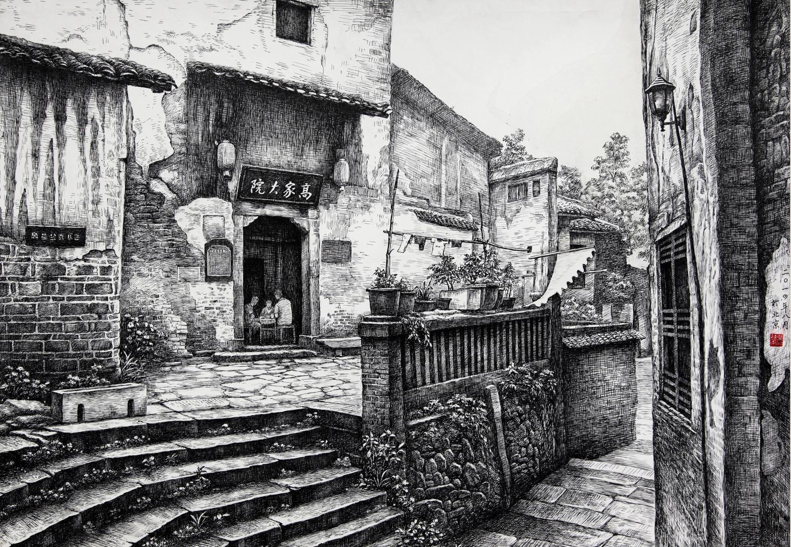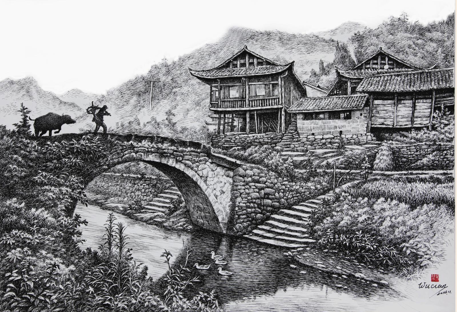 2004年一次偶然,退休闲居的吴慈安路过正在施工的步行街,欣欣向荣的感觉立即涌向心头。“我想要记录下来。可自己既没有带画笔,也没有带颜料,身上只有一支钢笔。”于是,吴慈安即兴用钢笔涂鸦,创作了有生以来的第一张钢笔画《春到山乡》。这张画作后来获奖并被一位买家收藏。这支小小的钢笔,敲开他全新的艺术世界。