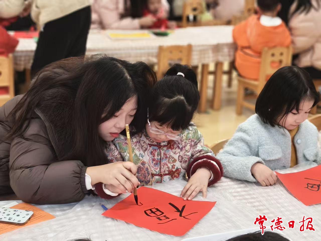 常德日报记者 黄云霞 通讯员 王玲 程兰 文/图 猜灯谜、词语接龙、对对联,感受文字的魅力;剪纸、扎染、操作皮影戏,亲手触摸传统之美……12月27日,湖南幼专附属幼儿园“亲时光,悦成长”非遗游园庆新年活动热闹举行。孩子们通过非遗、民间游戏等多元领域学习,沉浸式感受优秀传统文化魅力。
