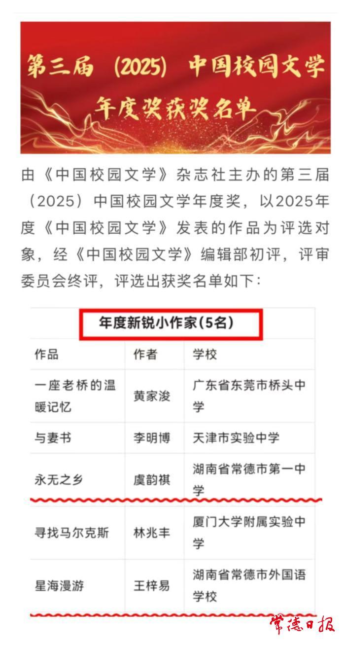常德日报记者 黄云霞 通讯员 熊芳 文/图 近日,第三届中国校园文学年度奖评选结果揭晓,常德市两名中学生脱颖而出,获评“年度新锐小说作家”。该奖项全国仅5人入选,常德学子占两席,展现出了不俗的文学创作实力。