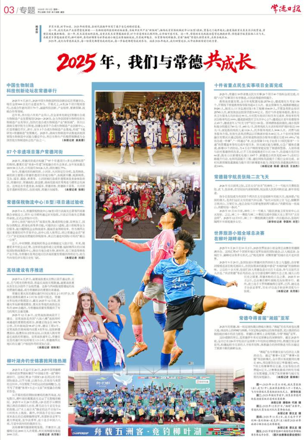 这一年,我们见证产业筋骨愈发强健——生物制造科技创新论坛启幕,为城市筑牢产业“新饭碗”;湘西北首家保税物流中心(B型)获批,贸易之门越开越大;渝厦高铁重庆东至长沙段贯通,重塑区域发展新格局。这一年,民生温度始终在线,省重点民生实事圆满收官,87个非遗项目扎根河街,让幸福可感可及。这一年,常德的目光既投向苍穹也拥抱世界:常德籍宇航员张陆二次飞天,承载家乡梦想遨游星河;柳叶湖畔,舟钓世锦赛与世界旅游小姐总决赛相继绽放,尽显城市魅力。体育赛场同样激昂,首届“湘超”常德队拼得亚军,点燃全城热血。