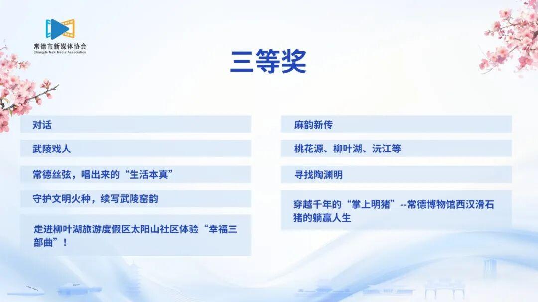 《老西门:在旧时光里邂逅新浪漫》《灵醒常德》《常德~它值得!Here is Changde,a city like a poem》《东山峰看日出逛茶园》《城市夜景》《常德原创歌曲〈相约常德〉MV》《显山露水》《一碗常德粉,千年沅澧香》《街巷藏情》《最美鼎城,打卡沅江风光带》《常德名字的由来》《河街的国庆之夜》《我骄傲我是常德人》《湖湘手艺——熏香篇》《港中坪智慧农田变形记:小田变大田,手机管灌溉》《桃花源里看青春——用一针一线绘出乡村振兴新画卷》《千年擂茶:非遗里的博物智慧与科学密码》《港中坪的四季密码》《端午趣游港中坪》《开学第一课,我们把“动物园”搬进了山区学校》《桃花源里灵醒常德等你来晒,看记者第三视角全记录“东江村排·益丰杯”vlog,好玩的都在这里啦!》《藏在博物馆里的常德烟火气》《传承非遗文化点亮青春记忆》《秋韵常德》