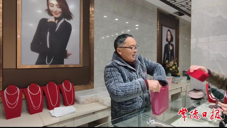 “你们喜欢我们的珍珠就好,只管选只管挑。我们下面是店上面是家,只有睡觉才关门。”1月29日时近晚上8点,馨恬珍珠店里还笑语喧哗。一群从常德来的客人在店里精挑细选,各种款式的珍珠项链、珍珠手链、珍珠耳环,白的、粉的、紫的,看得眼花缭乱。老板马超云夫妇做好的晚饭都顾不上吃,热情地把客人们请进来,让她们自己选自己试,还手脚不停地为客人带来的珍珠项链补珠修复,按客人的要求现场串珠,忙得不亦乐乎。