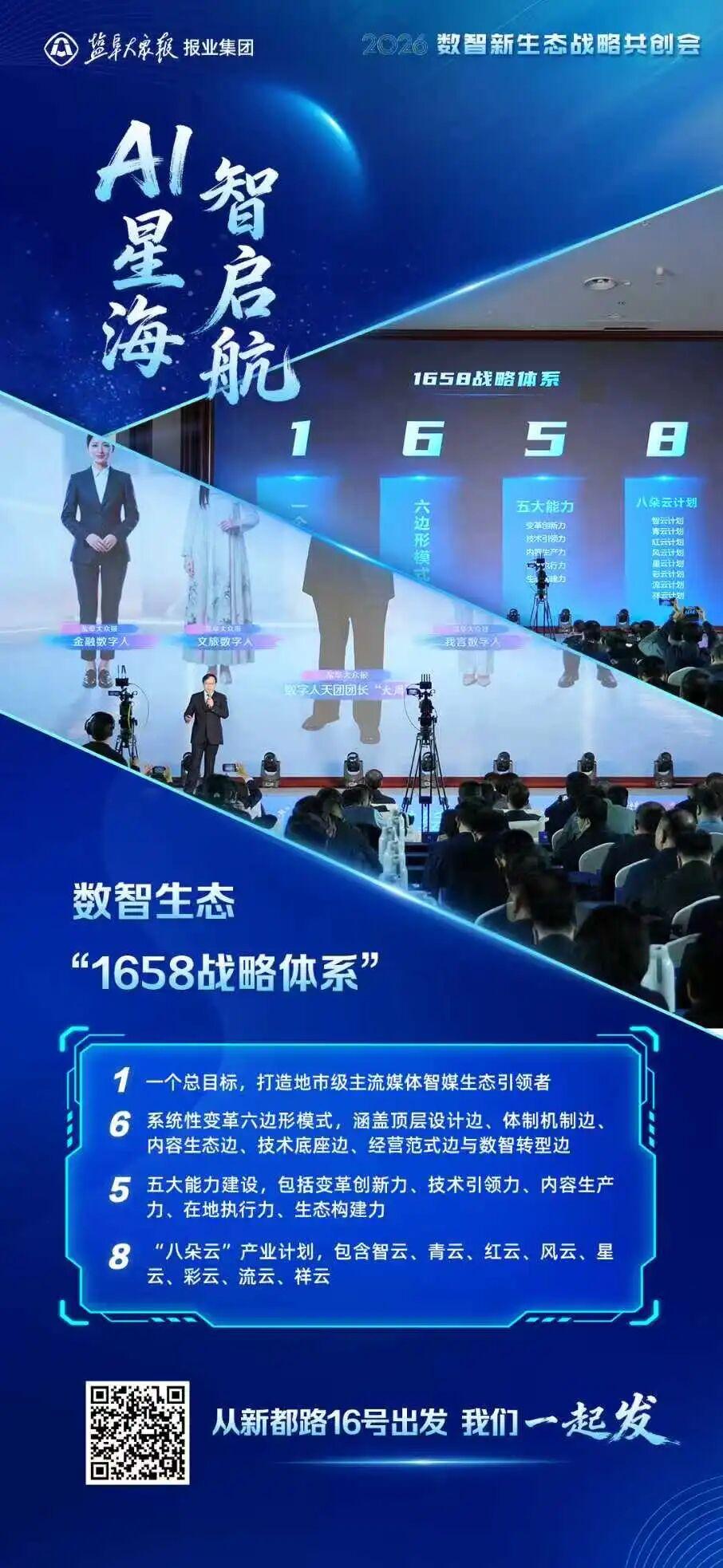 随后,周劲代表盐阜大众报发布数智新生态“1658战略体系”,结合当前AI技术发展趋势与主流媒体转型实际,系统阐释其核心内涵与实践路径。