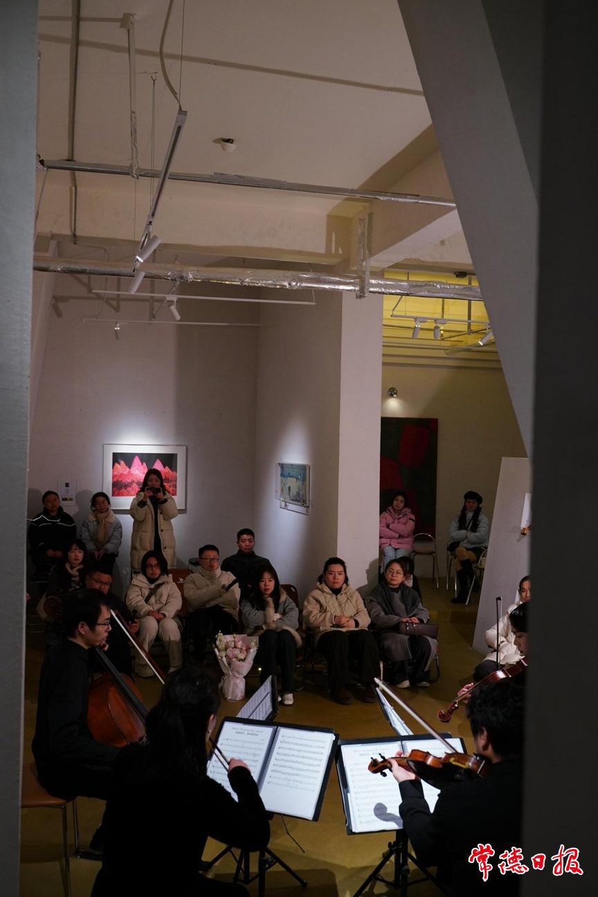当琴弓轻触琴弦,古典与流行的边界在此消融;当弦音交织流淌,艺术与空间的对话悄然开启。2月7日晚,位于常德市城区高泗路的几何画廊,一场名为“琉光”的弦乐四重奏开启,4位老友和约50名观众围坐在一起,共同创造出一场跨越时空的私宴。