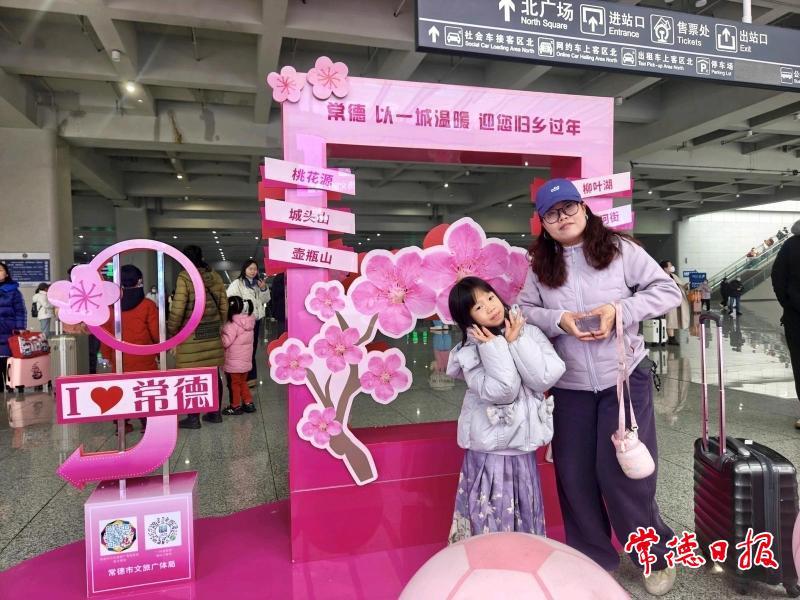 “一走出出站口,满满的家乡元素就让人心里一暖,回家的感觉扑面而来。”从北京返乡的桃源籍旅客张女士,正带着女儿在打卡点拍照、与“湘超”常德队吉祥物德宝、桃桃击掌互动。她说,离开家乡多年,此次春节带女儿回老家,被这充满温情的布置打动。她计划趁着假期带孩子畅游桃花源、漫步常德河街,感受家乡的变化。