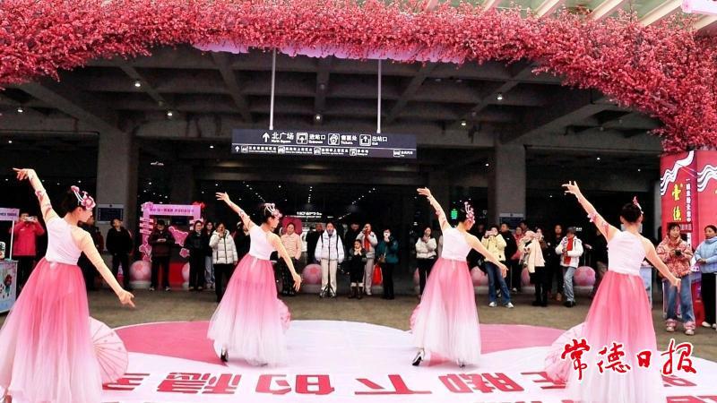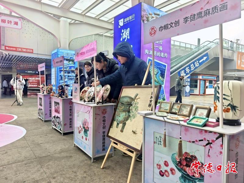 活动现场氛围感拉满,处处彰显“桃花源里的城市”特色。粉色桃花元素铺满地胶,石墩上的粉色足球彩绘俏皮亮眼,以常德山水人文为主题的打卡点位前,吸引不少返乡旅客驻足拍照,定格美好瞬间。灯箱包柱上展示着常德桃花源、柳叶湖等重点景区景点的秀丽风光、文旅品牌赛事活动、常德米粉等特色美食。专属文旅展台分列两边,桃源刺绣、麻质画等非遗文创静静陈列,一批本土企业的优质产品集中亮相,现场还有免费姜茶为返乡旅客驱寒送暖。随后,舞蹈《梦入桃花源》等节目一一亮相,全方位展现常德的烟火气息与文化魅力。