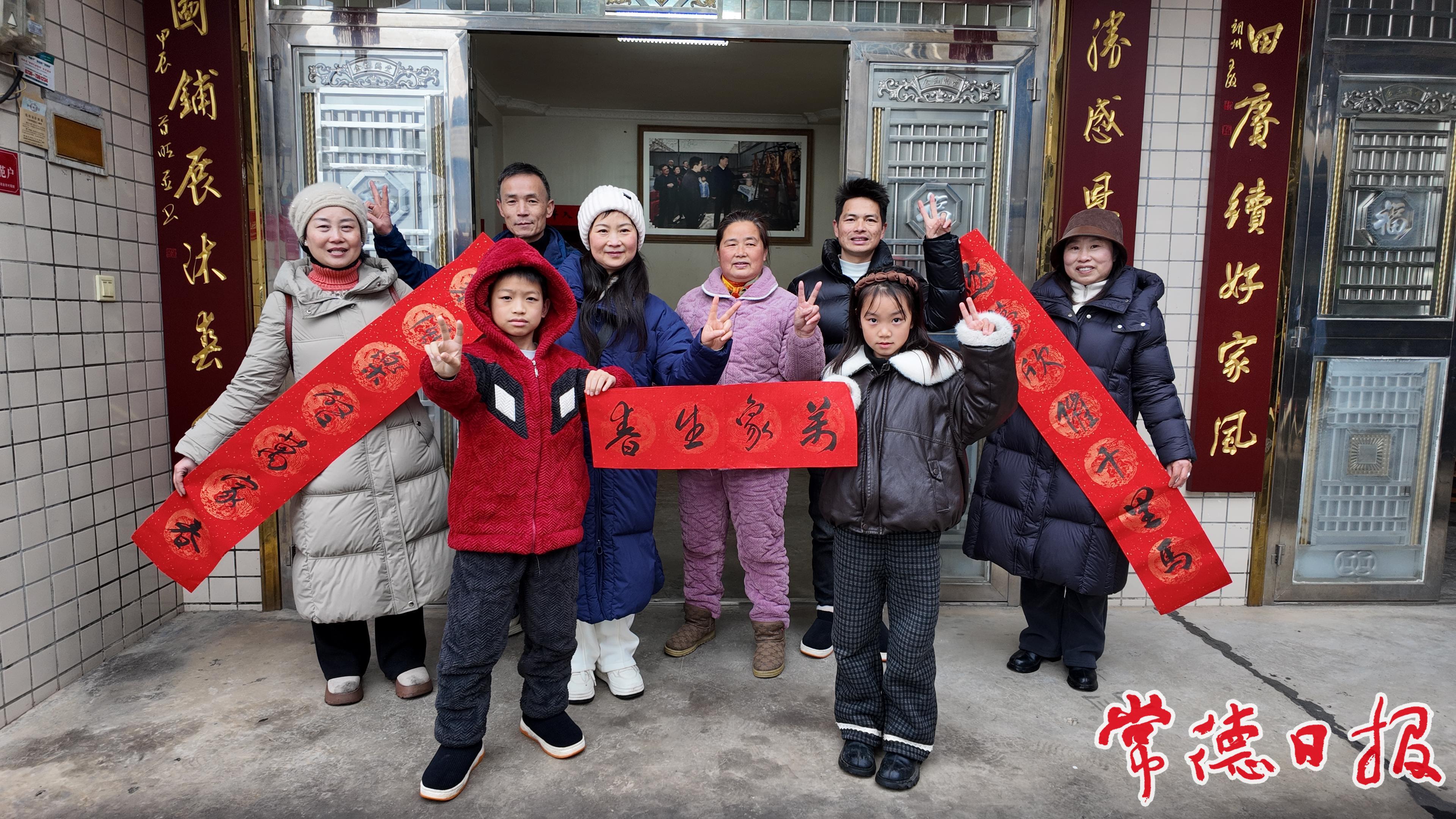 春节前夕,常德市楹联家协会走村入户送“福”字。协会常务副主席、秘书长刘立军在院子门前驻足:“这副大门联是给戴宏家量身定制的。”“地种小康心种善,家生大美国生春。”戴宏的妻子周敏边念边感悟:“这是一份精神食粮,‘心种善’‘国生春’,大格局,感觉我们种田不只是养家,而且和国家连在一起了。”她说,一家人分工协作,父亲负责调配人力物力,母亲负责后勤,戴宏专攻农机技术,她则边带娃边做些喜欢的工作,一家人把日子过得稳稳当当。