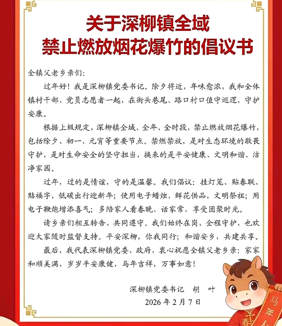 “过年,过的是情谊,守的是温馨。我们倡议:挂灯笼、贴春联、贴福字。用电子鞭炮增添喜气;多陪家人看春晚、话家常,享受团聚时光。”在社区的微信群里,记者还看到了两封特别的公开信,其中一封是《关于深柳镇全域禁止燃放烟花爆竹的倡议书》。信中明确,根据上级规定,深柳镇全域、全年、全时段禁止燃放烟花爆竹,包括除夕、初一、元宵等重要节点。