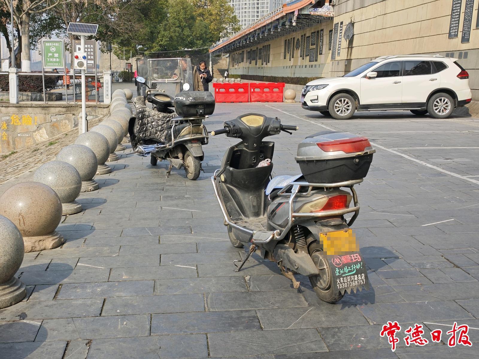 上午10时许,记者在公园内看到,尽管景区多处设有禁烟标识,仍有人“吞云吐雾”。有人边走边抽,烟灰随手弹落。在公园临河道路上,有两辆电动车随意停放在过道上,与不远处一旁的“规范停车”提示牌形成对比,这过道本是供市民游客通行的便道。