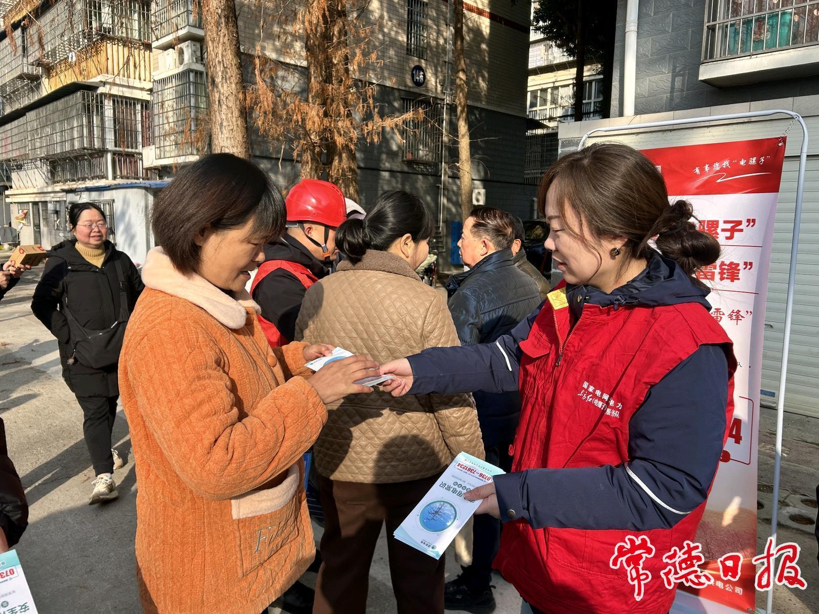 常德日报记者 蔡文龙 通讯员 徐静怡 文/图“张阿姨,新年好!我们是供电公司的,特意来给您拜年啦!这张24小时供电服务联系卡已经贴在表箱上,家里用电有任何问题,随时联系我们,随叫随到!”2月17日,大年初一,国网常德供电公司组织站所负责人及台区经理,来到武陵区长庚街道熊家台社区开展属地服务宣传与春节安全用电科普活动,将暖心服务与新春平安祝福送到居民家门口。
