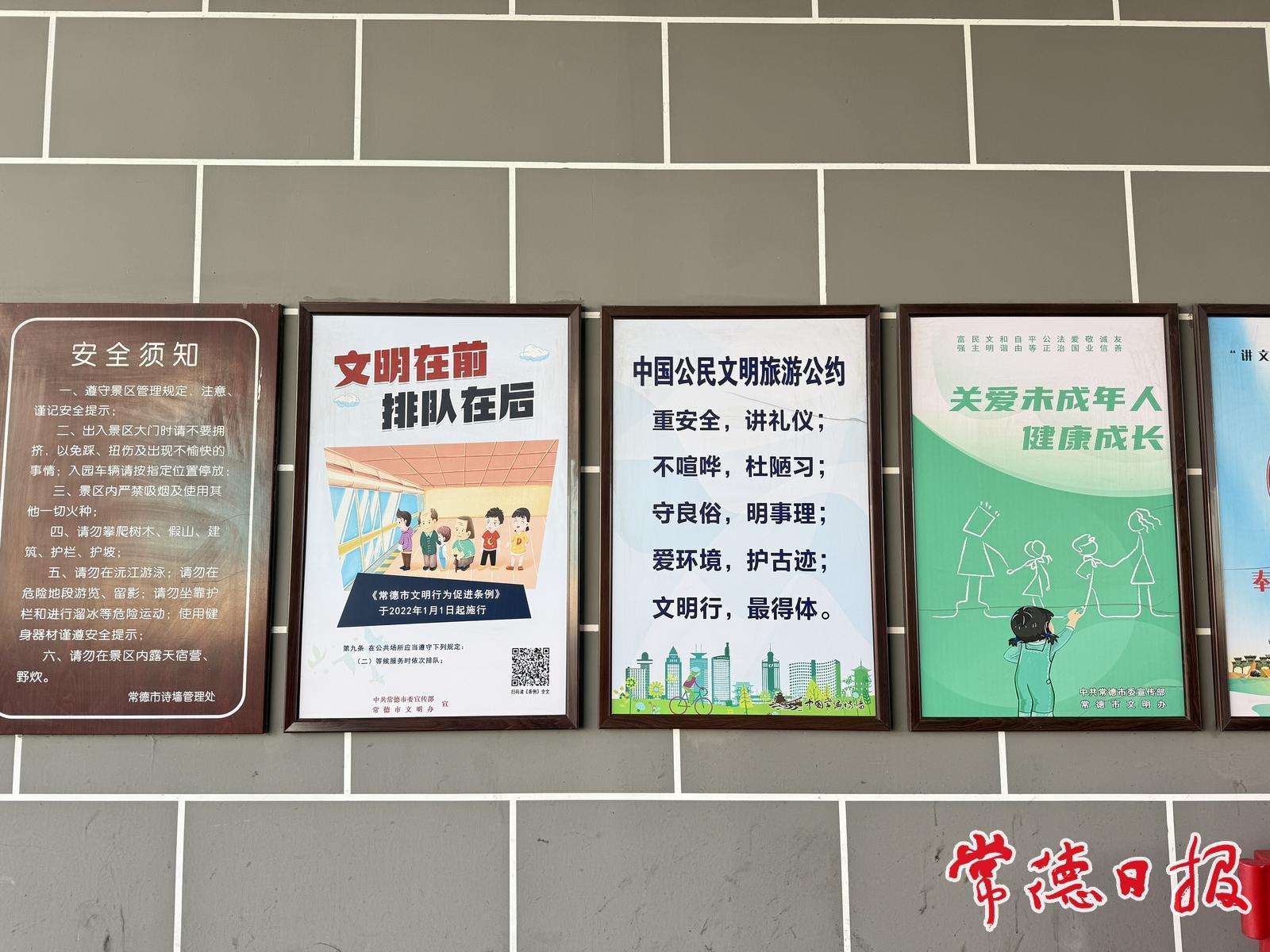 公园门口,《常德市文明行为促进条例》《中国公民文明旅游公约》的海报十分醒目;停车场内,游客车辆在工作人员的引导下,有序停放;长廊处,游客们驻足观赏,或拍照留影,或三三两两交流讨论,没有人大声喧哗;石凳上,休憩的游客在春日阳光下享用美食的同时,也不忘将垃圾装进随身携带的垃圾袋里;带着宠物出游的游客全程牵着宠物牵引绳。