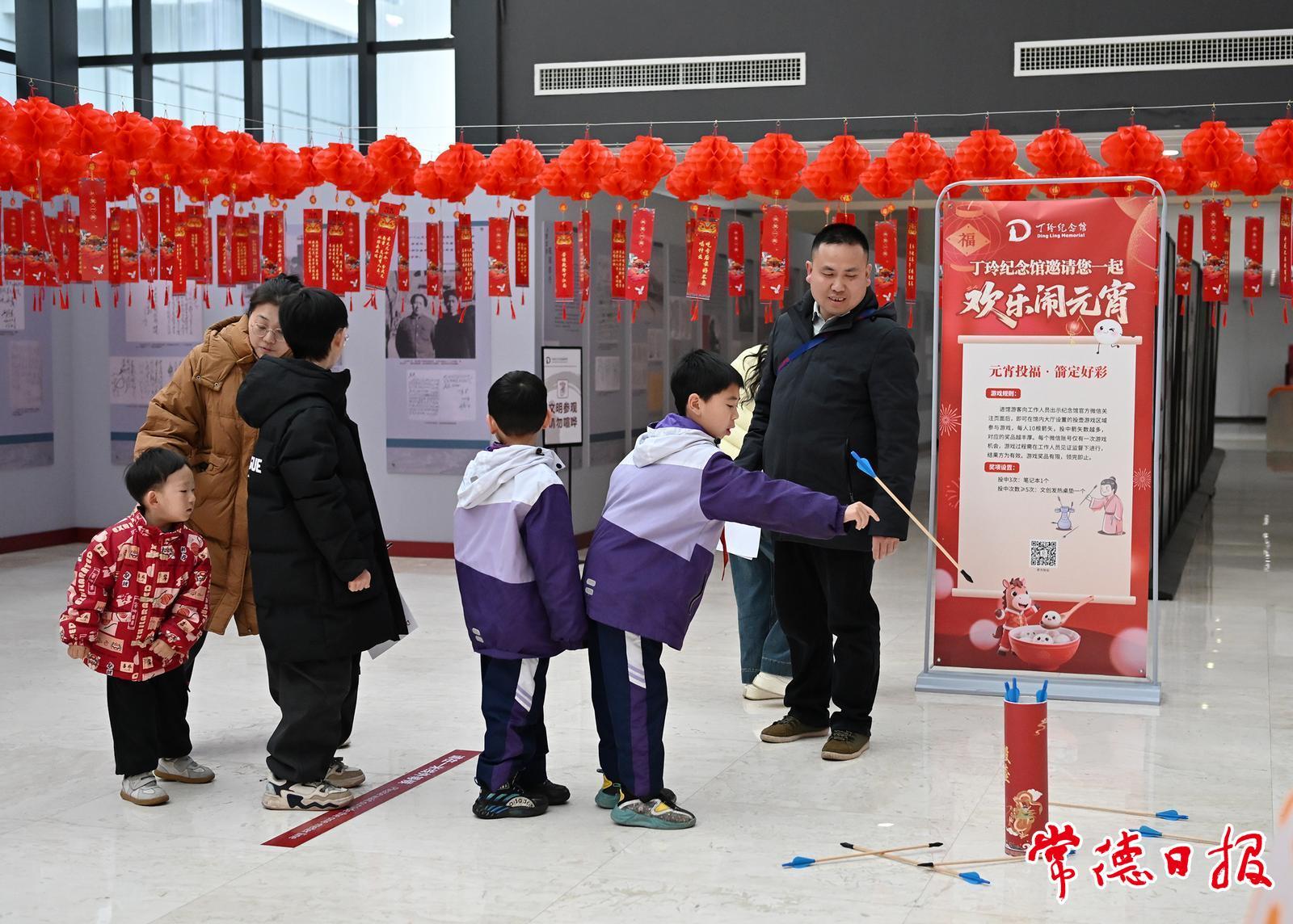 馆内不仅动脑氛围浓,动手区域同样欢笑声不断。在民俗游艺区,“夹元宵”挑战赛考验着两人的默契配合,“元宵投福·箭定好彩”投壶游戏,游客们则手持箭矢体验古人的雅趣。