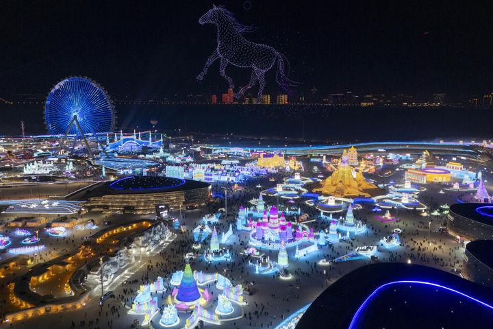 这是2026年1月5日拍摄的哈尔滨冰雪大世界园区的无人机表演(无人机照片)。新华社记者 张涛 摄