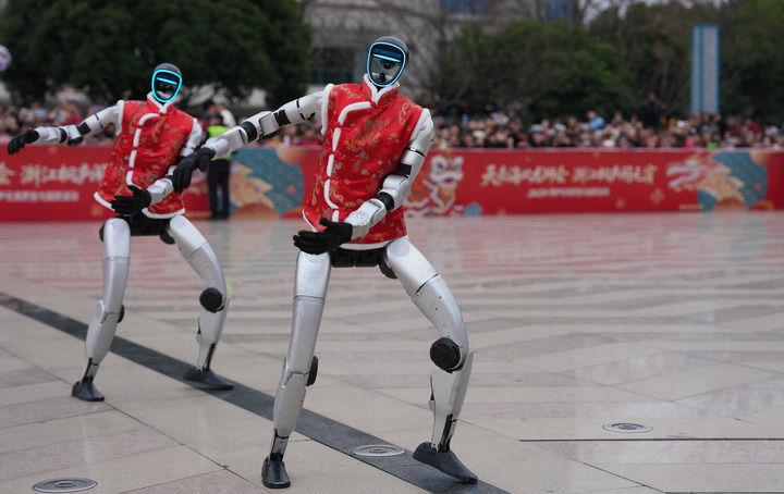 2026年2月28日,宇树科技人形机器人在浙江省桐庐县中心广场表演舞蹈。新华社记者 黄宗治 摄