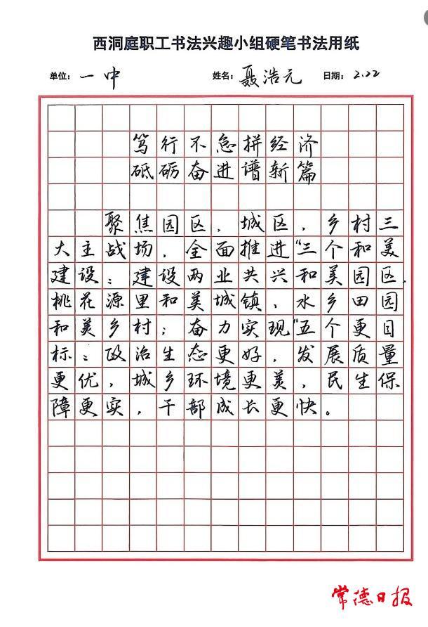 常德日报记者 杨荣国 通讯员 聂浩元 文/图 近日,为深入学习贯彻西洞庭管理区2026年经济工作会议精神,凝聚奋进力量,展现新时代职工风采,西洞庭管理区职工书法兴趣小组精心组织举办了硬笔书法作品展。