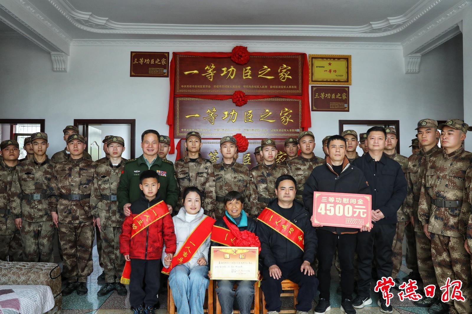 常德日报记者 刘清 王明睿 文/图 为深入弘扬拥军优属优良传统,切实把党和政府的关怀与尊崇送到军人军属心坎上,3月2日,鼎城区人武部联合区退役军人事务局为2025年立功受奖的现役军人家庭上门送喜报、颁牌匾、送慰问金,以庄重热烈的仪式,传递荣誉和温暖,让“一人参军、全家光荣”的理念深入人心。