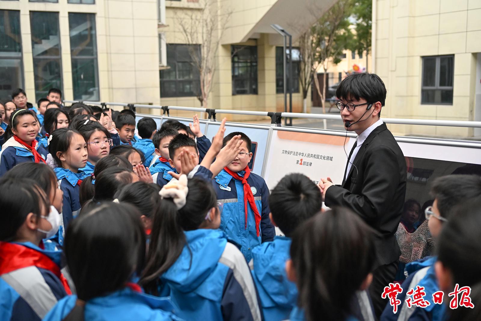 “同学们知道文物有哪些类型吗?”进入提问互动环节,学生们争相举手,现场气氛瞬间被点燃。讲解员耐心解答,并鼓励大家从身边小事做起,争做红色基因的传承者和文物保护的践行者。活动最后,学生们有序参观了《中华人民共和国文物保护法》移动展牌,进一步加深对文物保护知识的理解。