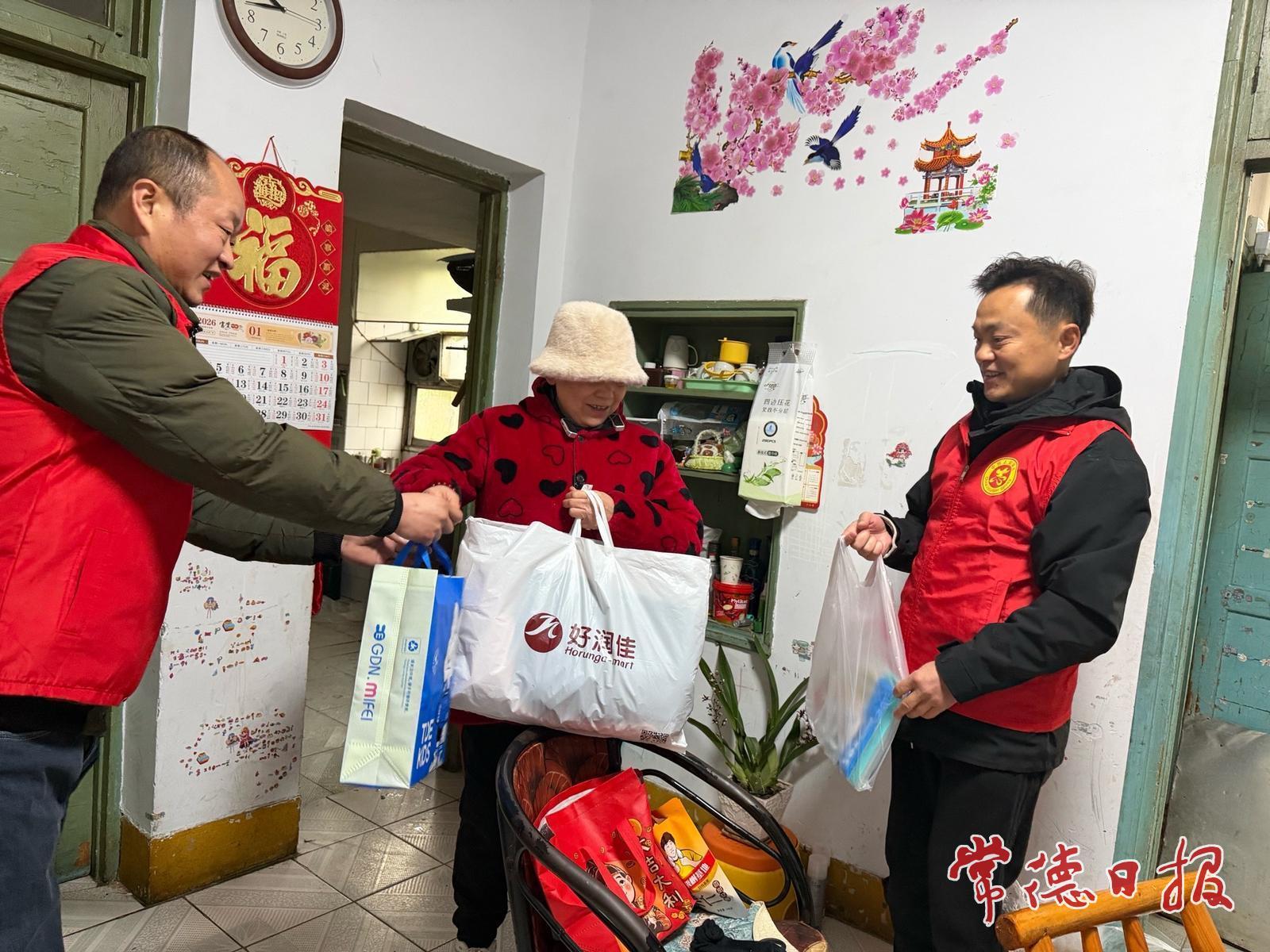 孩子的父母均为重度残疾,一家人的生活全靠老人操持。志愿者给孩子试穿新衣,询问他的学习情况,又围坐在客厅里陪老人拉家常:“孩子最近成绩怎么样?”“换季的衣服够不够穿?”简简单单几句话,让这间简陋的小屋顿时有了家的温度。