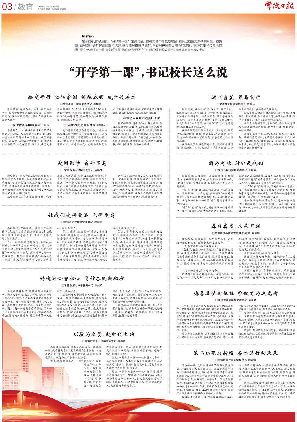 春归校园,逐梦启航,“开学第一课”如约而至。常德市各中学党委书记、校长以寄语为新学期开篇。寄语里,有对教师深耕教育的嘱托,有对学子惜时奋进的期许,更有对校园育人初心的坚守。本版汇集各校暖心寄语,愿这份春日的力量,激励师生不负韶华、笃行不怠,在新征程上勇毅前行,共赴教育与成长之约。