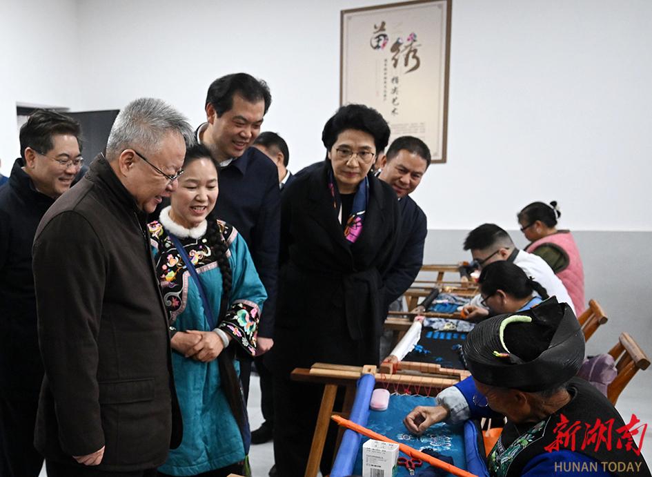 近年来,花垣县以十八洞村为中心,将周边5个村纳入片区抱团发展。来到片区东连台山村,沈晓明走进苗绣生产车间,了解片区均衡发展、苗绣智能化生产销售等情况,指出要牢记习近平总书记殷殷嘱托,全心全意为人民服务,以协调发展促进共同富裕,带领老百姓把日子越过越好;要探索利用人工智能等现代化信息技术,更好推动苗绣等非遗技艺传承和发展。